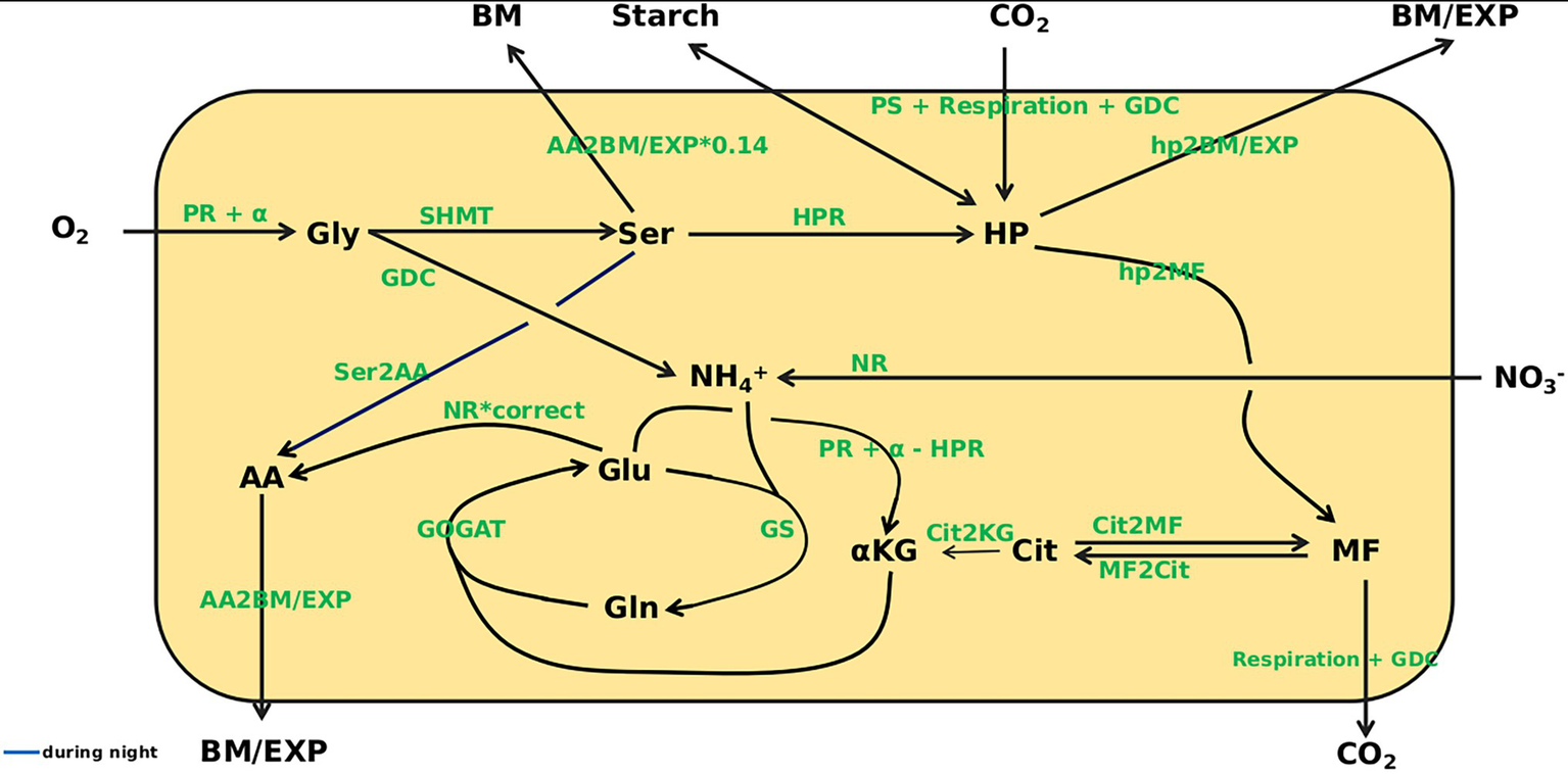 During the reaction from Gly to Ser NH4+ is produced and, together with Glu, can be used by GS to produce Gln (Supplementary Image 2). Gln can transaminate α-KG, catalyzed by GOGAT, to produce two molecules of Glu. Two reactions can yield α-KG that is required for AA production. The first reaction is from Cit (Cheung et al., 2014) representing the TCA cycle and cytosolic isocitrate dehydrogenase activity (Hodges, 2002). The second is from Glu and includes the reaction of Glu-glyoxylate-aminotransferase, which is part of PR, as well as mitochondrial Glu dehydrogenase and transamination reactions involving Glu. For Gly production, a source of N is required. This can derive from Ser, which, in the model, is included in the combined HPR flux. Alternatively, Glu can serve as N donor for Gly production. The PR flux into the system, the HPR flux, and the reaction from Glu to α-KG are all N1-fluxes. Thus, the three fluxes can be balanced, and Glu to α-KG can be expressed as PR minus HPR.