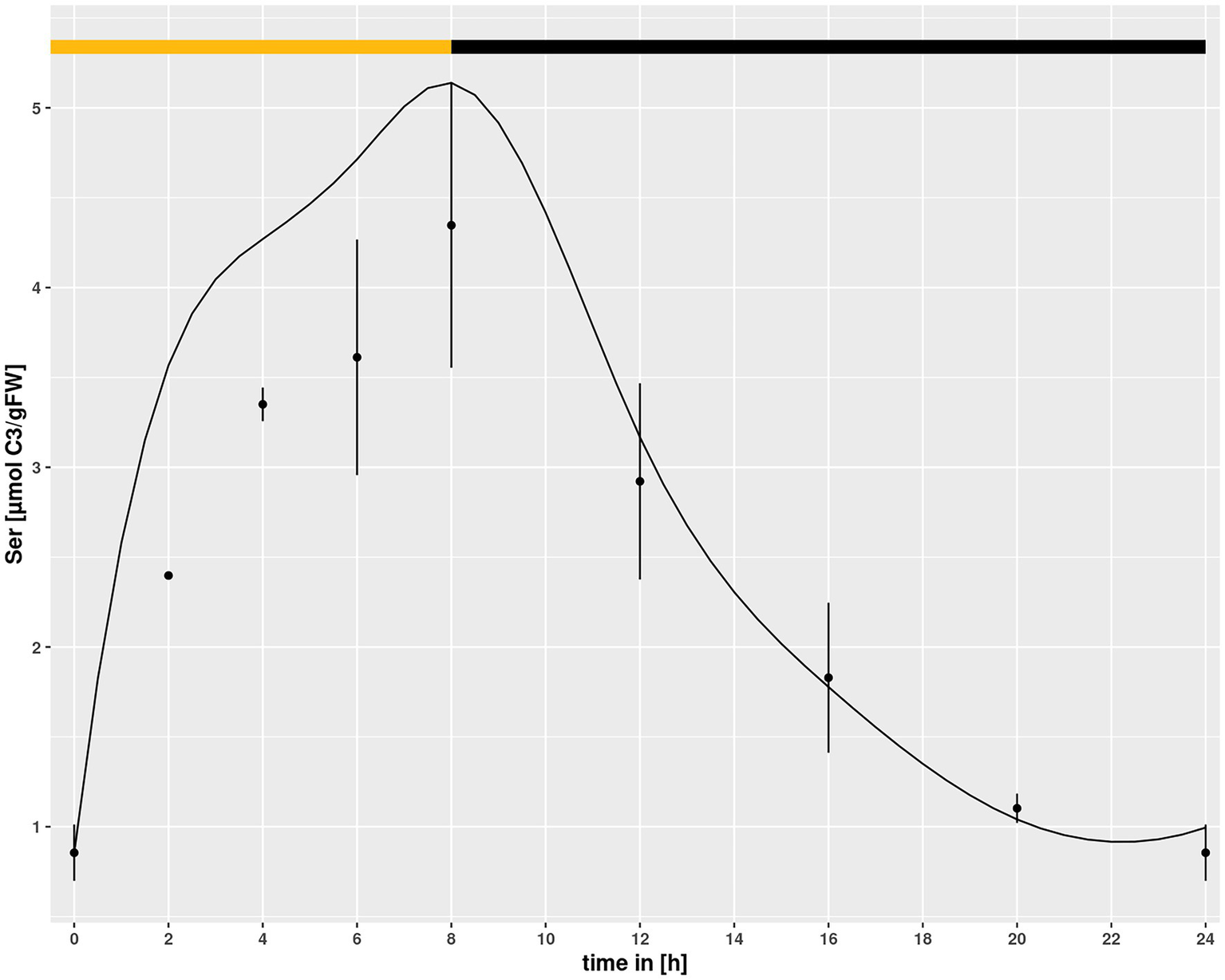 Diurnal course of serine for hpr1-1 at eCO2 concentrations. Dots represent means with standard error (n = 5). Lines represent the mean of 20 simulations using the minimum of the km value of the simulations of Col-0 ambient CO2 as lower boundary. The light phase is indicated by a yellow bar and dark phase indicated by black bar.