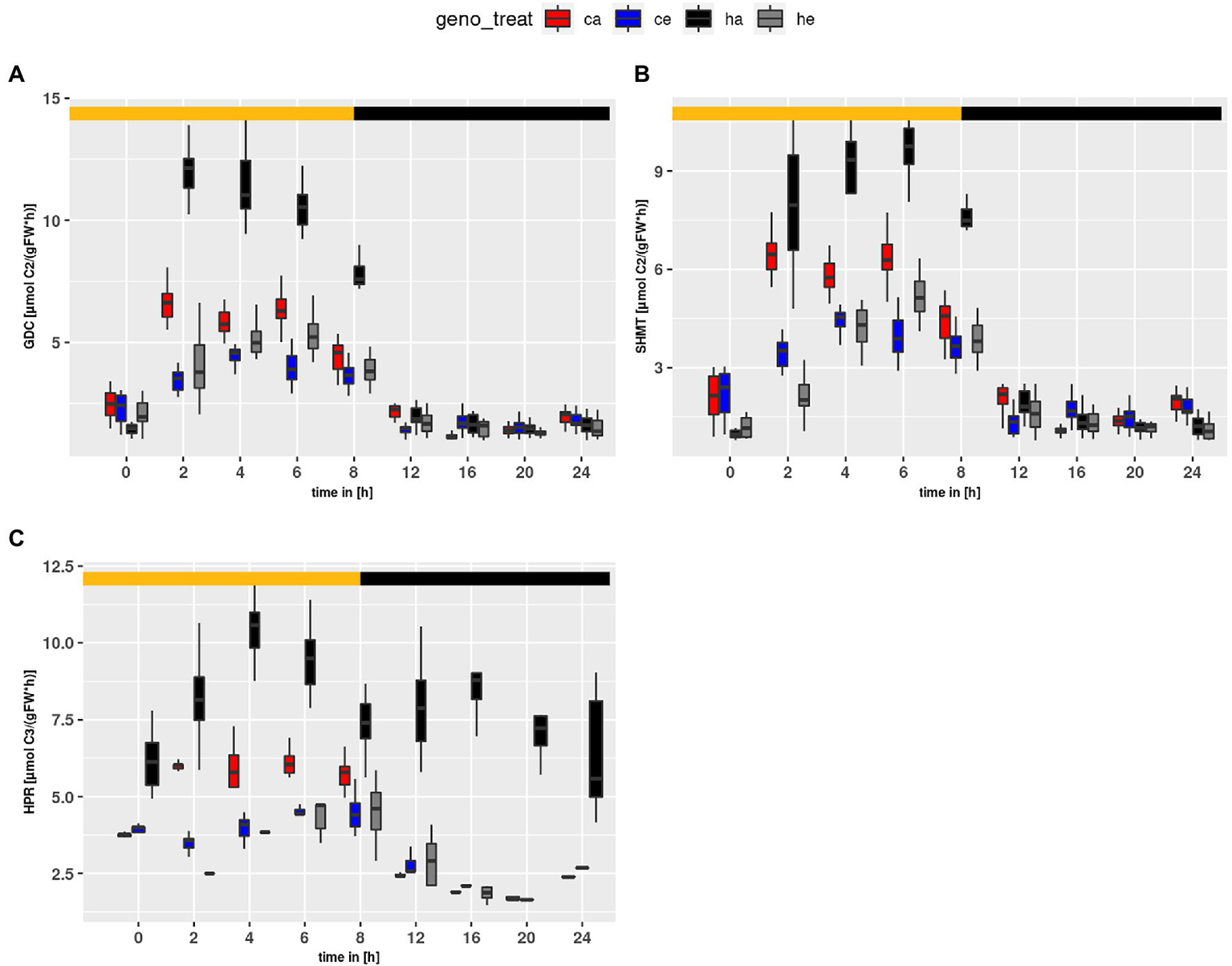 Diurnal course of fluxes for (A)GDC, (B)SHMT and (C)HPR. Col-0 ambient: red, Col-0 eCO2: blue; hpr1-1 mutant ambient: black, hpr1-1 mutant eCO2: grey. Shown are means of results for 20 simulations. Light phase is indicated by yellow bar and dark phase indicated by black bar. Boxplots are dodged by 0.25 h in order to prevent overlap.