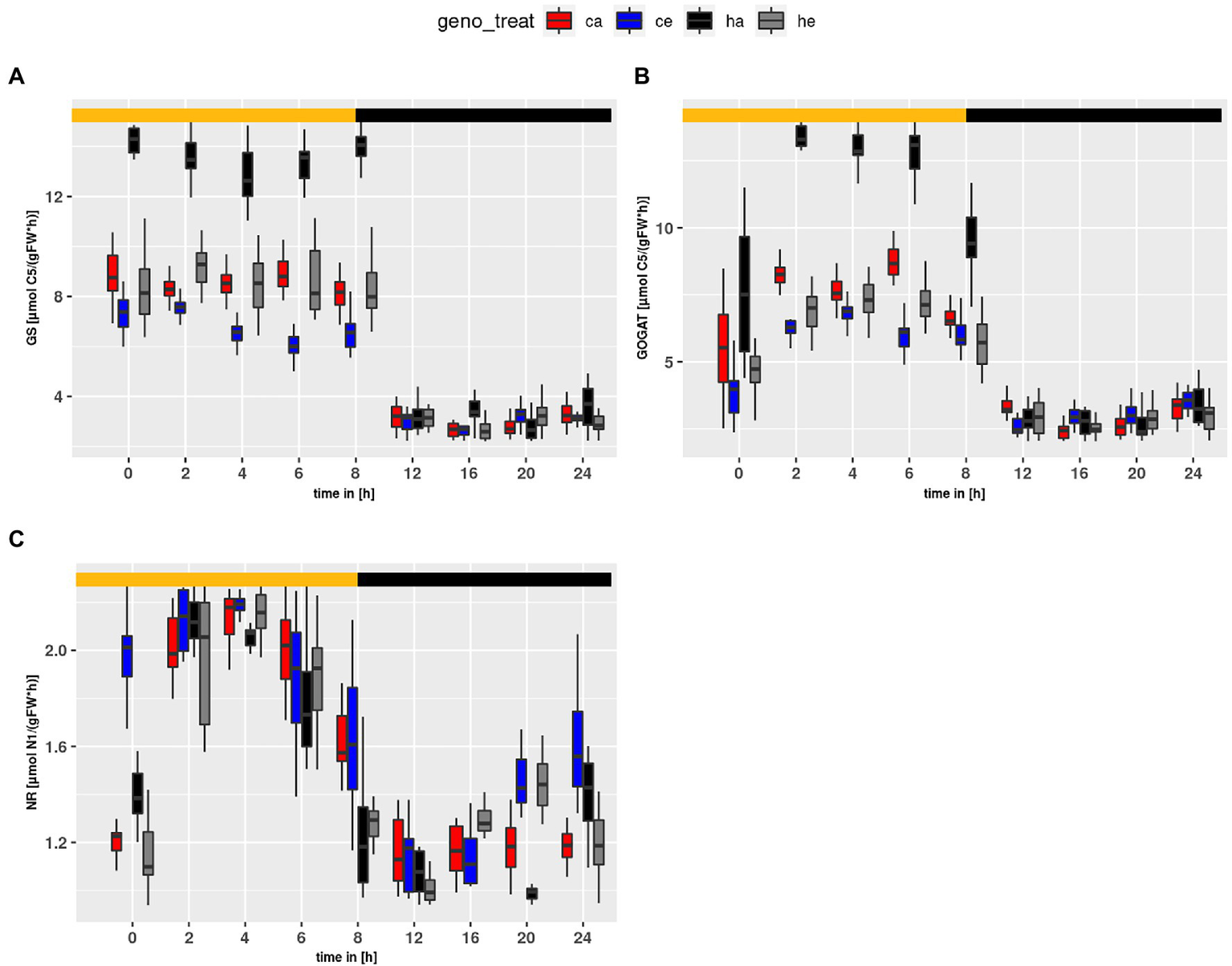 Diurnal course of fluxes for (A) GS, (B) GOGAT and (C) NR. Col-0 ambient: red, Col-0 eCO2: blue; hpr1-1 mutant ambient: black, hpr1-1 mutant eCO2: grey. Shown are means of results for 20 simulations. Light phase is indicated by yellow bar and dark phase indicated by black bar. Boxplots are dodged by 0.25 h in order to prevent overlap.