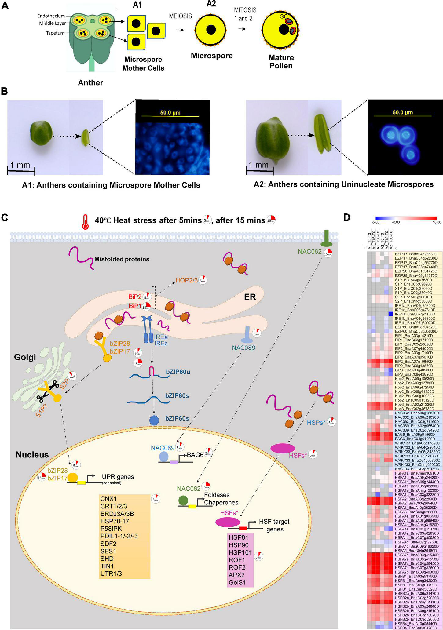 (A) A diagrammatic representation of sectioned anther showing microspore mother cells (A1 anther stage), microspore (A2 anther stage) and mature pollen. (B)Brassica napus anther samples collected for RNA-sequencing. Anthers containing microspore mother cells (A1) and anthers containing uninucleate microspores (A2) were collected immediately after 5, 15, and 30 min of high-temperature exposure at 40°C. (C) Rapid transcriptional reprogramming of genes associated with unfolded protein response in the ER and cytoplasm within 5–30 min of heat stress exposure of the anthers (A1 and A2); the 5 min clock icon indicates the upregulation of gene after 5 min of heat stress, and the 15 min clock icon indicates the upregulation of gene after 15 min of heat stress. (D) Heatmap showing the Log2fold change in expression of transcripts associated with regulation of unfolded protein response in the ER and cytoplasm in anthers containing microspore mother cells and anthers containing uninucleate microspores subjected to heat stress for 5, 15, and 30 min; the transcripts in the light yellow box highlight the transcripts regulating the two arms of the unfolded protein response in ER, i.e., the bZIP28/17 dependent pathway and the bZIP60-IREa/b dependent pathway; the transcripts in the light blue box are ER-UPR associated NAC TFs and their selected targets; and the transcripts in the light magenta box are heat shock transcription factors (HSFs) which are associated with the regulation of unfolded protein response in the cytoplasm.