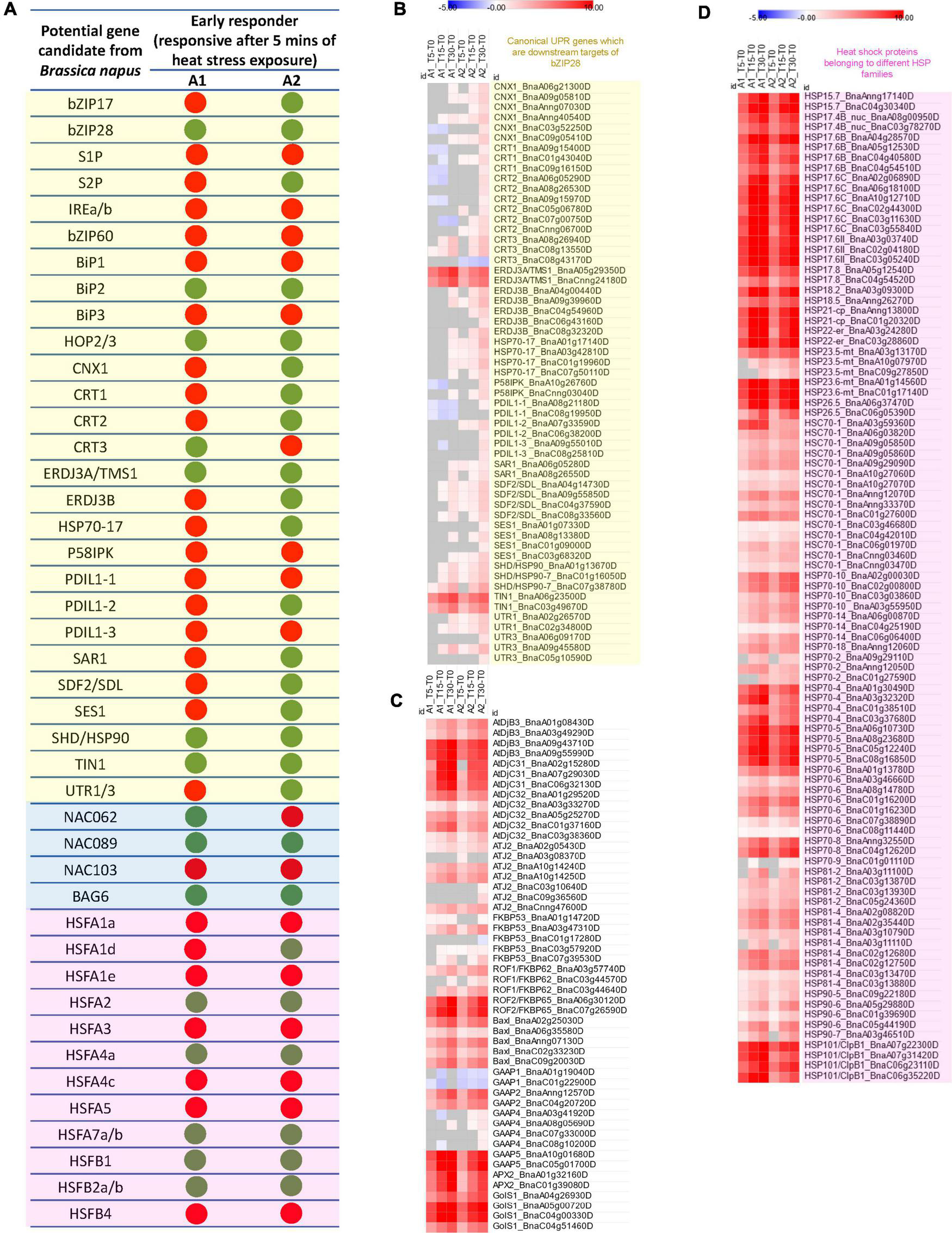 (A) Early heat stress-responsive genes involved in the regulation of UPR (transcripts regulating the two arms of the unfolded protein response in ER, i.e., the bZIP28/17 mediated pathway and the bZIP60-IREa/b mediated pathway as well as canonical ER-UPR genes which are downstream targets of bZIP28; light yellow box) in ER, ER-UPR associated NAC TFs and their selected targets (light blue box) and cytoplasm (HSFs; light magenta box) in anthers containing microspore mother cells (A1) and anthers containing uninucleate microspores (A2) subjected to heat stress for 5 min. The green dot represents the 5 min of heat stress-induced change in expression of the gene, and the red dot represents no significant change in gene expression after 5 min of heat stress (Note: The potential gene candidate in B. napus was identified as an early heat stress-responsive gene if even one of the gene homologs displayed a significant change in expression, adjusted p-value < 0.01). Heatmaps showing the Log2fold changes in transcript expression of (B) Canonical UPR genes which are downstream targets of bZIP28 (light yellow box), (C) foldases, co-chaperones, BAX Inhibitor-1 (BAXI-1), Golgi-apoptotic proteins (GAAPs), Galactinol synthase1 (GolS1) and Ascorbate peroxidase2 (APX2), and (D) heat shock proteins belonging to different HSP families (light magenta box).