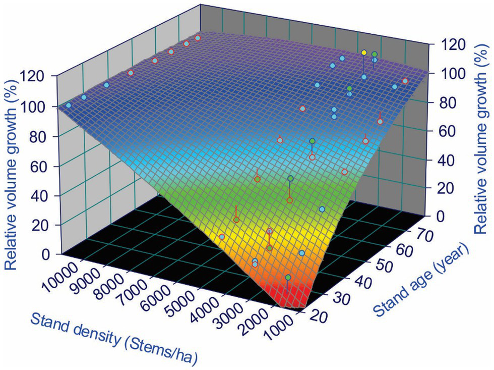 A 3D surface plot using a smoothing function for relative volume growth under different stand densities and ages shows the trend of CG that occurred over the study area. From Table 2, we observe that almost all plots from Block C reached exact or overcompensation, and that all plots from Block B were below 100% compensation. Plots from Block A were a mix of under, exact and overcompensation. Therefore, as an example of such a 3D surface plot, Figure 2 shows the data from the Block A of the MacKey thinning trial.