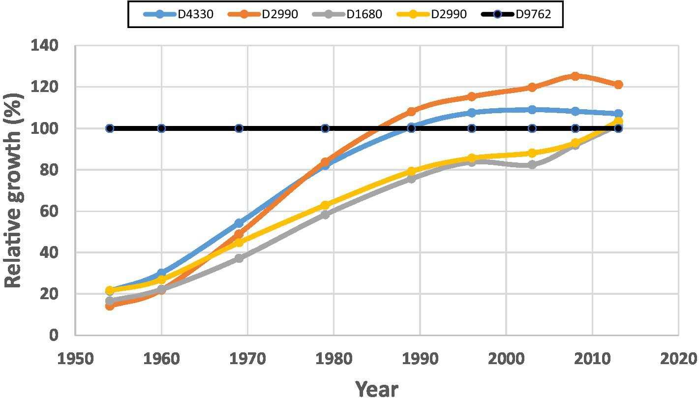 Other alternative indicators could also be developed, such as the changes in mean periodic annual increment (mPAI), as suggested in Li et al. (2020). However, here we focus on the relative growth because of its simplicity and ease of calculation.