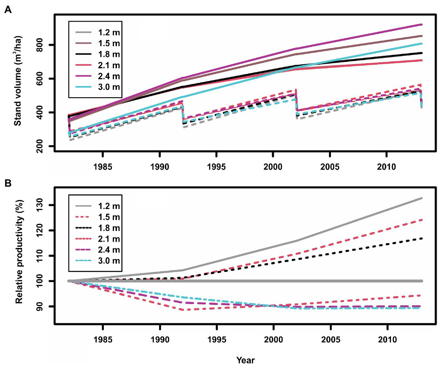 Stand gross volumes (A: in which solid lines indicate control plots, and dashed lines indicate thinned plots) and relative productivity (volume growth) (B: in which the line of 100% indicates the control plots, >100% indicates overcompensation, and <100% indicates under compensation) of planted red pine (Pinus resinosa Aiton) under different spacing regimes created by initial planting density and thinning in Chalk River, Ontario, Canada.