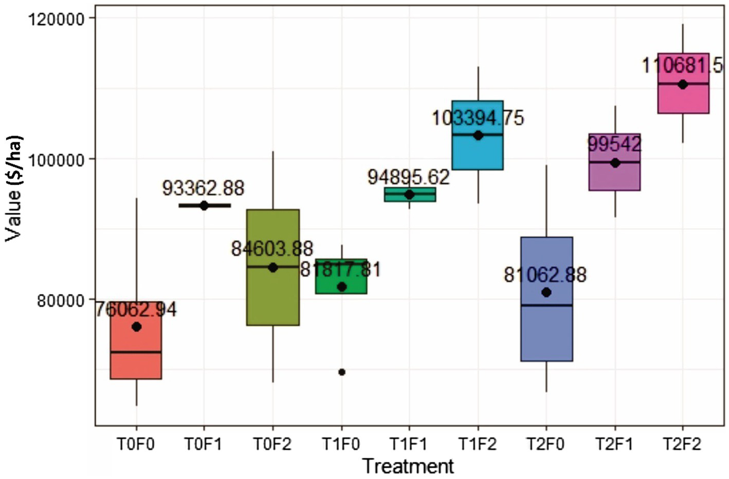 A two-way ANOVA (McDonald, 2014) was used to investigate whether the average stand commodity values could be significantly influenced by different levels of thinning and fertilization, as well as their interactions for the Shawnigan Lake dataset. ANOVAs were conducted using the car package in R v. 4.0.4 (Fox and Weisberg, 2019). We used p < 0.01 as a significance threshold.