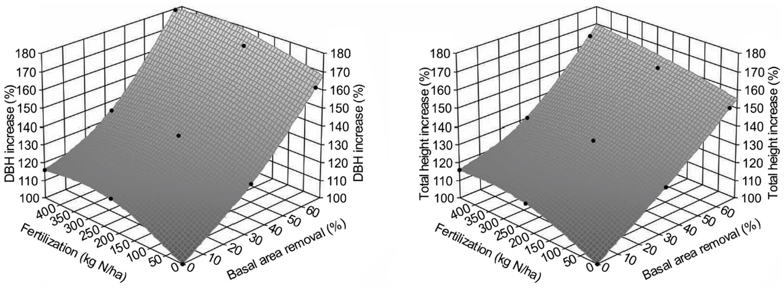 The scattered RG data for different variables were smoothed as a surface to represent the trend of RG under different thinning (including PCT or CT) and fertilization treatments when applicable, using TableCurve 3D (SYSTAT Software Inc., 2002).