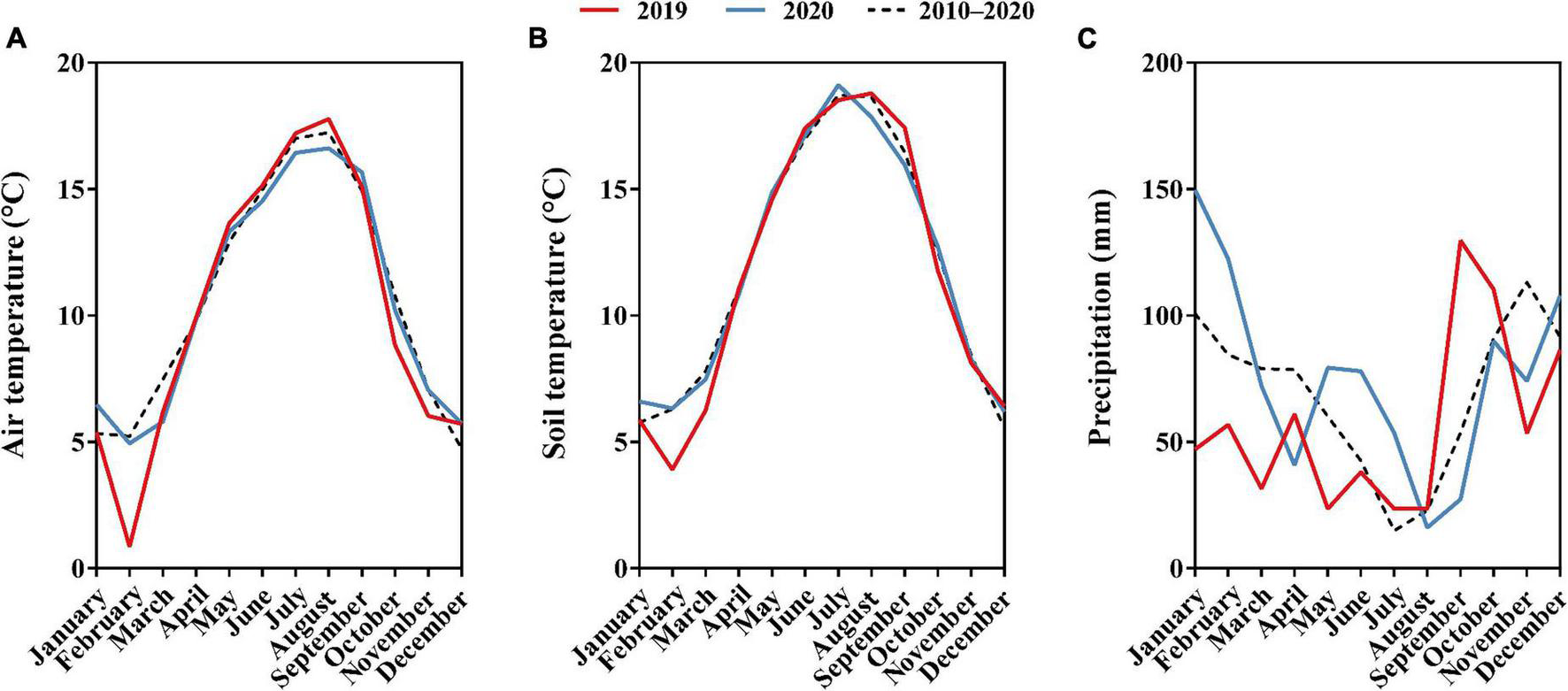 (A) Monthly average air temperature (°C) of 2019, 2020, and 2010–2020. (B) Monthly average soil temperature (°C) of 2019, 2020, and 2010–2020. (C) Monthly average precipitation (mm) of 2019, 2020, and 2010–2020 in the experimental area located in northwestern Washington. Data provided by WSU AgWeatherNet.