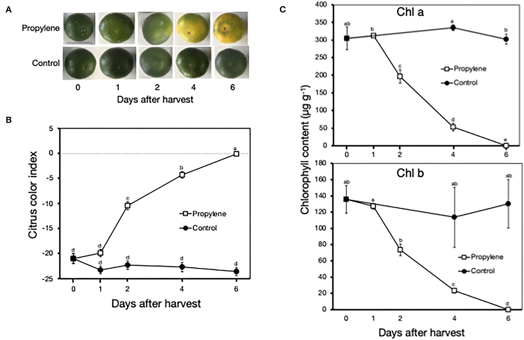 Propylene treatment triggered a color change in the peel of Satsuma mandarin fruit from green to yellow after 4 and 6 days (Figure 1A), which was indicated by a rapid increase in CCI from −21.0 at harvest to −4.3 at 4 days and −0.1 at 6 days (Figure 1B). In accordance with the loss of green color in propylene-treated fruit, Chl a and Chl b content decreased from the initial at-harvest values of 300 μg g−1 and 135 μg g−1, respectively, to almost undetectable levels at 6 days (Figure 1C). Non-treated control fruit remained green, showed insignificant changes in CCI, and maintained high Chl a and Chl b content throughout the experimental period.