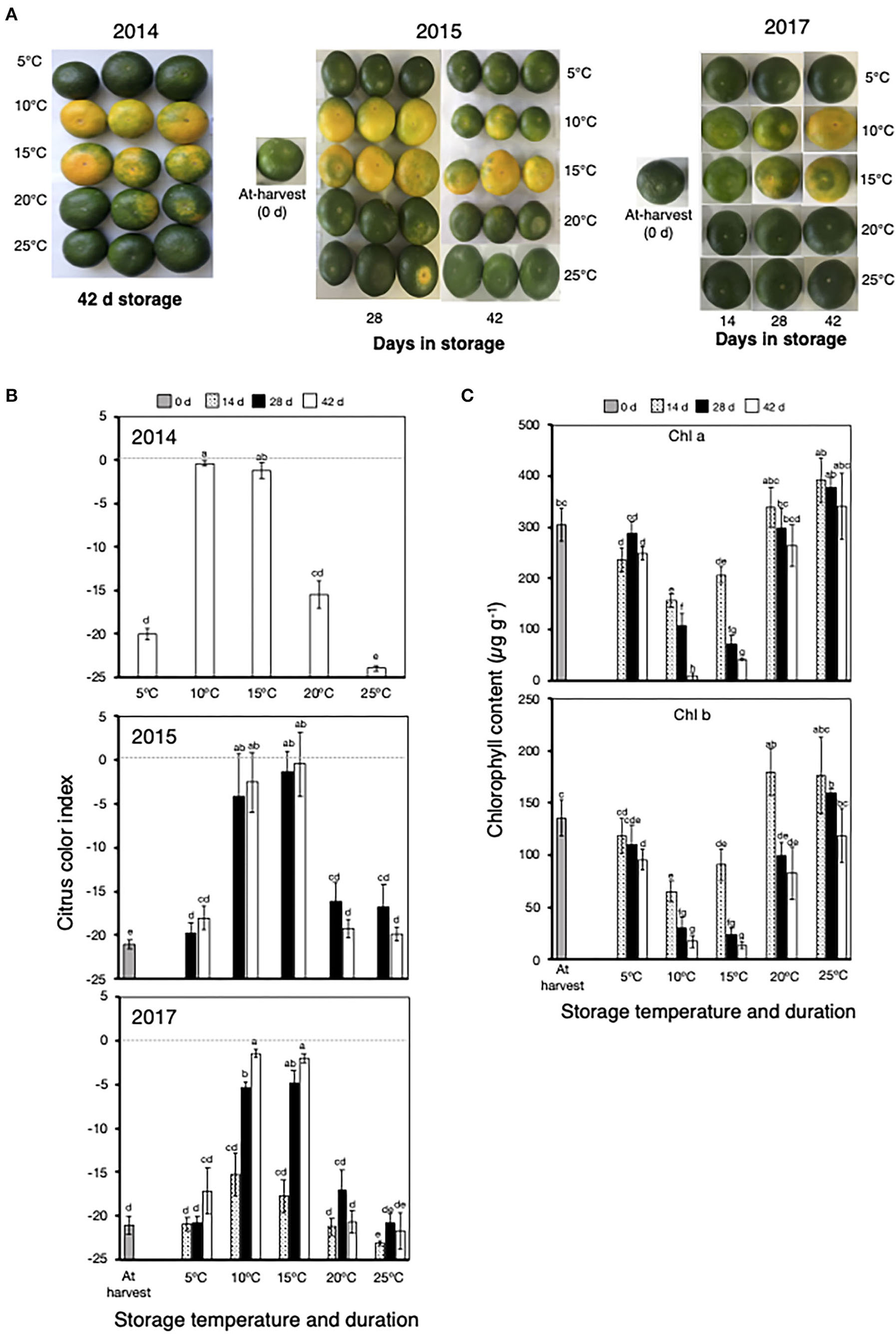 In 2014, 2015, and 2017, fruit stored at 10°C and 15°C showed an appreciable change in peel color from green to yellow after 28 and 42 days (Figure 2A), with a concomitant increase in CCI from the initial at-harvest values of about −21.0 to approximately −5.0 at 28 days and near-zero values at 42 days (Figure 2B). There was also a substantial decrease in the content of both Chl a and Chl b during storage at 10°C and 15°C, particularly after 28 and 42 days (Figure 2C). By contrast, there were no observable changes in the peel color, CCI values, and Chl content of fruit during storage at 5°C, 20°C, and 25°C throughout the entire storage duration.