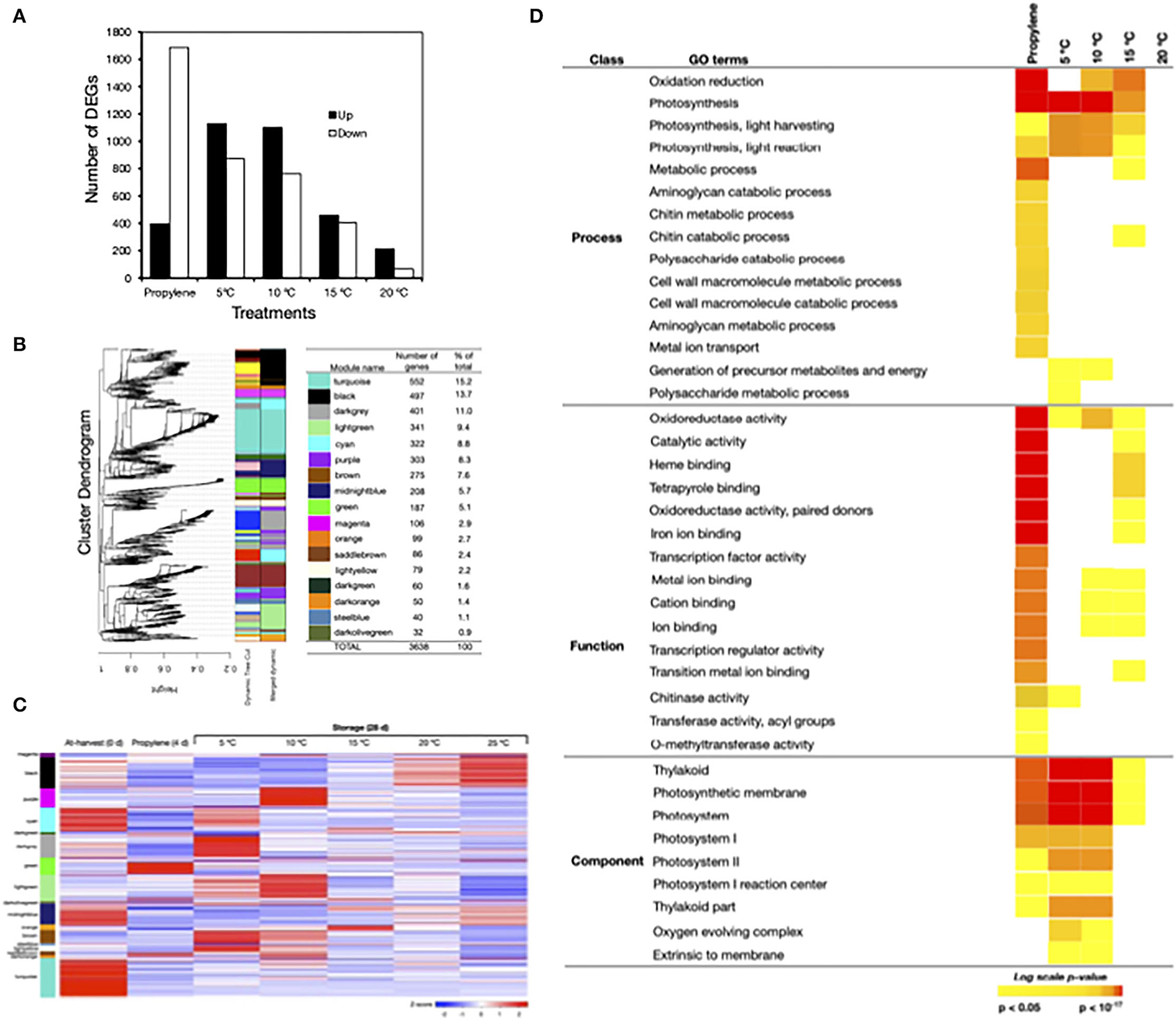 Transcriptomic changes in the flavedo of Satsuma mandarin fruit in response to propylene and different storage temperatures. (A) Number of genes that were differentially expressed in response to propylene treatment and storage at 5°C, 10°C, 15°C, and 20°C. Propylene effect was determined using at-harvest (0 days) samples as a control, whereas the control samples for storage temperature tests included fruit at 25°C. (B) Weighted gene coexpression network analysis (WGCNA) of differentially expressed genes (DEGs) identified from the flavedo of Satsuma mandarin fruit treated with propylene or stored at different temperatures. The left panel shows the cluster dendrogram with the major tree branches. The right panel shows the different colors assigned to each one of the 17 modules obtained after implementing the tree cut line (0.15) to merge close modules and the number of genes in each module. (C) Heatmap showing the expression measures of genes in each WCGNA module at harvest (0 days), after 4 days propylene treatment and 28 days storage at the specified temperatures. (D) Selected gene ontology (GO) terms that were enriched among the DEGs that responded to propylene treatment or storage at 5°C, 10°C, and 15°C. Color panels display the P-values of the respective GO enrichment terms.