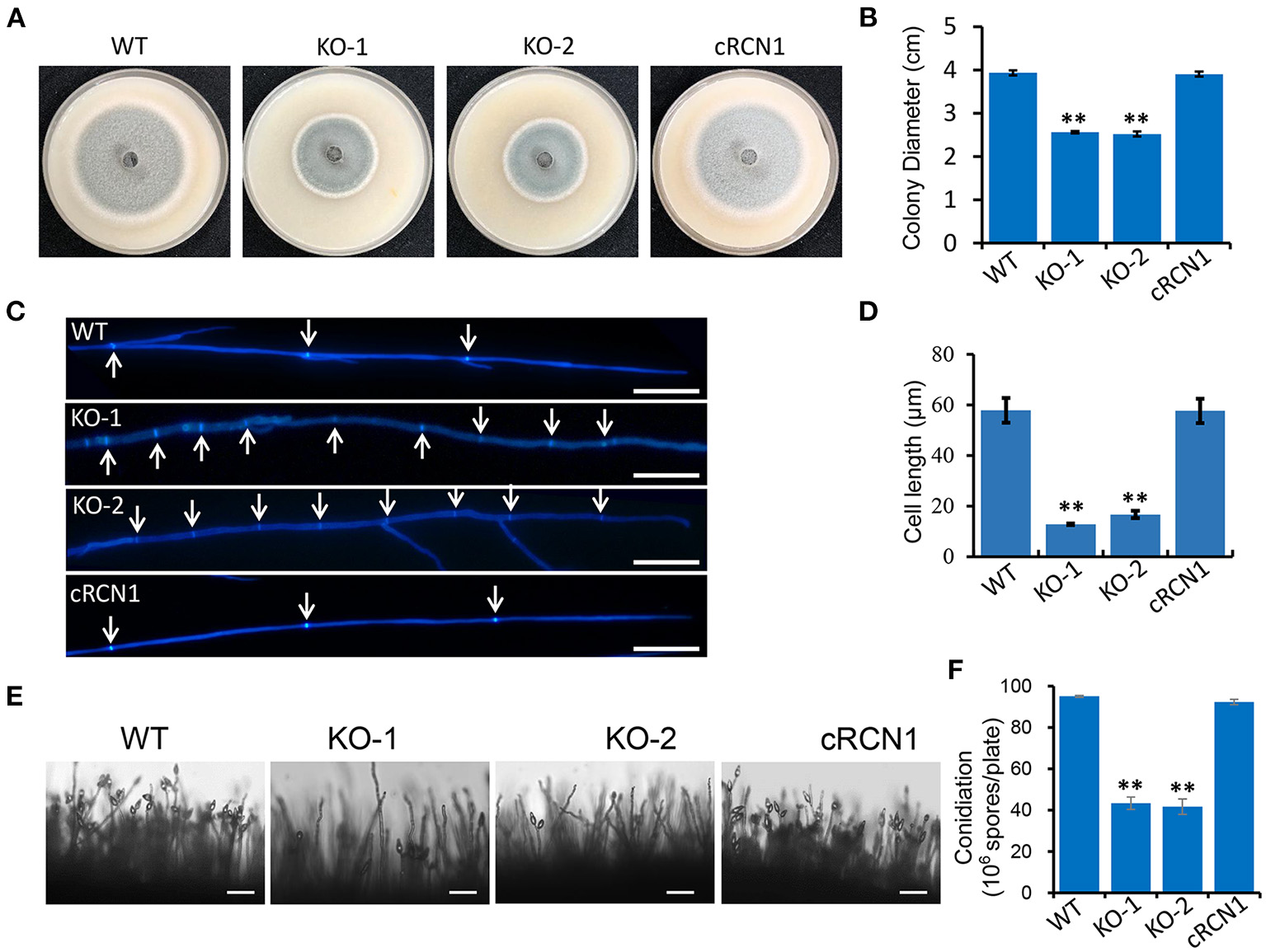 Figure 1. MoRCN1 is involved in vegetative growth. (A) Colony morphology of the wild-type P131, ΔMorcn1 mutants, and complemented strains were observed on oatmeal tomato agar (OTA) plates at 28°C for 5 days. (B) The colony diameters were measured and subjected to statistical analysis. Error bars represent standard deviation, and asterisk represents significant differences (P < 0.01). (C) Hyphal tips of the wild-type P131, ΔMorcn1 mutants, and complemented strains. The arrows indicate septa between cells. Bar 20 μm. (D) Cell length of the apical and subapical cells in the hyphae tips of strains in (C). Means ± SD were calculated from three independent experiments. Significant differences compared to the wild type (WT) are indicated by an asterisk (P < 0.01). (E) Conidial and conidiophore formation were observed under a light microscope. The indicated strains were grown on OTA plates for 5 days. Bar 50 μm. (F) Statistical analysis of conidiation of the wild type, ΔMorcn1 mutants, and complemented strains. Error bars represent the standard deviation, and asterisks represent significant differences (P < 0.01).