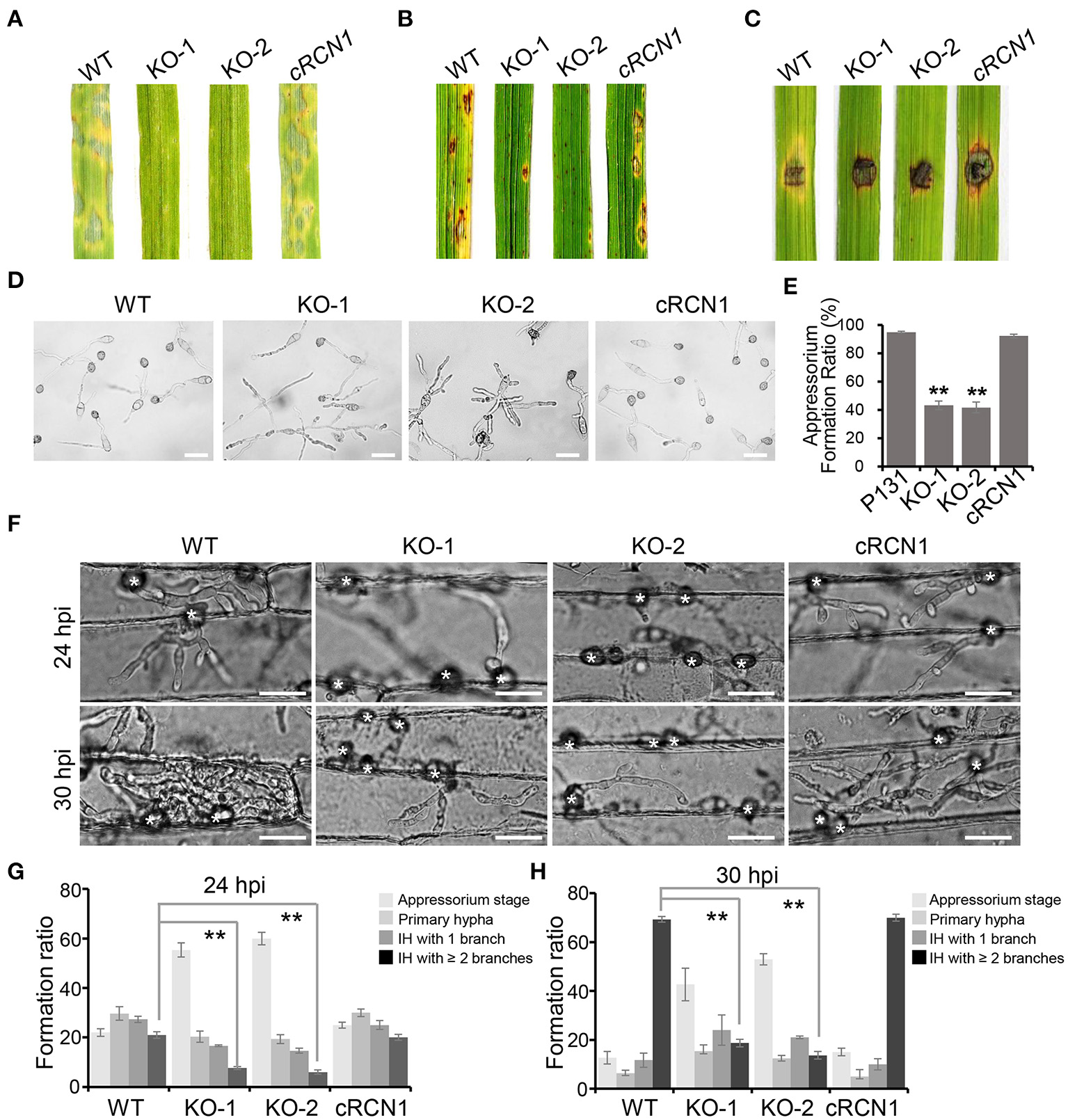 Figure 2. Deletion mutants of MoRCN1 lead to severe reduction in virulence. (A) Virulence test on barley leaves. Lesions formed on barley leaves were sprayed by conidia (3 × 104 conidia/ml) of indicated strains and observed at 5-day post inoculation (dpi). (B) Virulence test on rice seedlings. Lesions formed on rice leaves were induced by spray inoculation with conidia (1.5 × 105 conidia/ml) of indicated strains and observed at 5 dpi. (C) Lesions formed on wounded rice leaves. The wounded rice leaves were inoculated by mycelia blocks of different strains and observed at 4 dpi. (D) Appressorium formation were observed under a light microscope. The conidia of tested strains were inoculated on hydrophobic surfaces and calculated at 18 hpi. Bar 30 μm. (E) Statistical analysis of appressoria formation ratio. Error bars represent the standard deviation, and asterisks represent significant differences among strains (P < 0.01). (F) Invasive hyphae (IH) formed in barley epidermal cells infected by different strains at 24 and 30 hpi. Bar = 30 μm. (G) Formation ratio of different patterns of infection structures at 24 hpi. (H) Formation ratio of different patterns of infection structures at 30 hpi. For (G) and (H), percentages of appressoria (AP), primary invasive hyphae (PH), and IH with branches in barley epidermal cells were calculated. Means and standard deviation were calculated from three independent replicates. Significant differences compared to the WT are indicated by asterisks (P < 0.01).