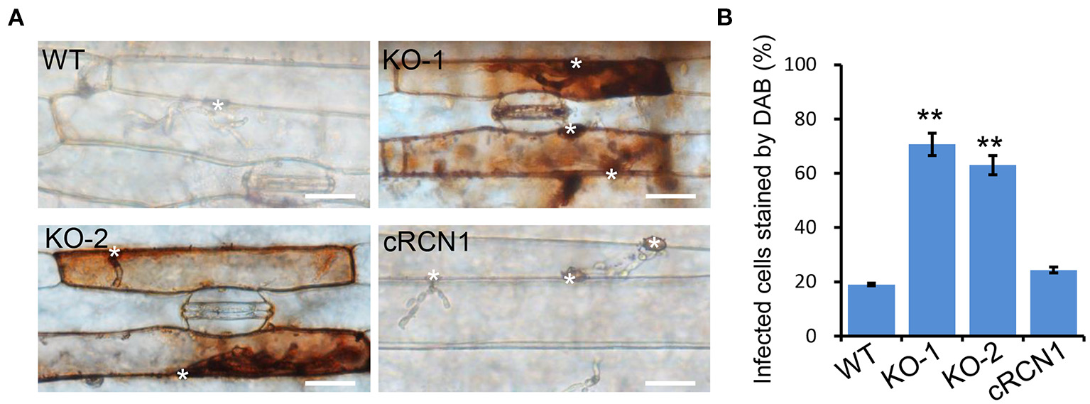 Figure 4. Deletion mutants of MoRCN1 induce accumulation of host reactive oxygen species (ROS). (A) DAB staining assay. Barley epidermis infected by the wild type, ΔMorcn1 mutants, and complemented strains was stained with 3,3-diaminobenzidine (DAB) at 30 hpi. The asterisk indicates the appressorium. Bar 20 μm. (B) Statistical analysis for percentage of the infected cells stained by DAB. Significant differences were indicated by asterisks (P < 0.01).