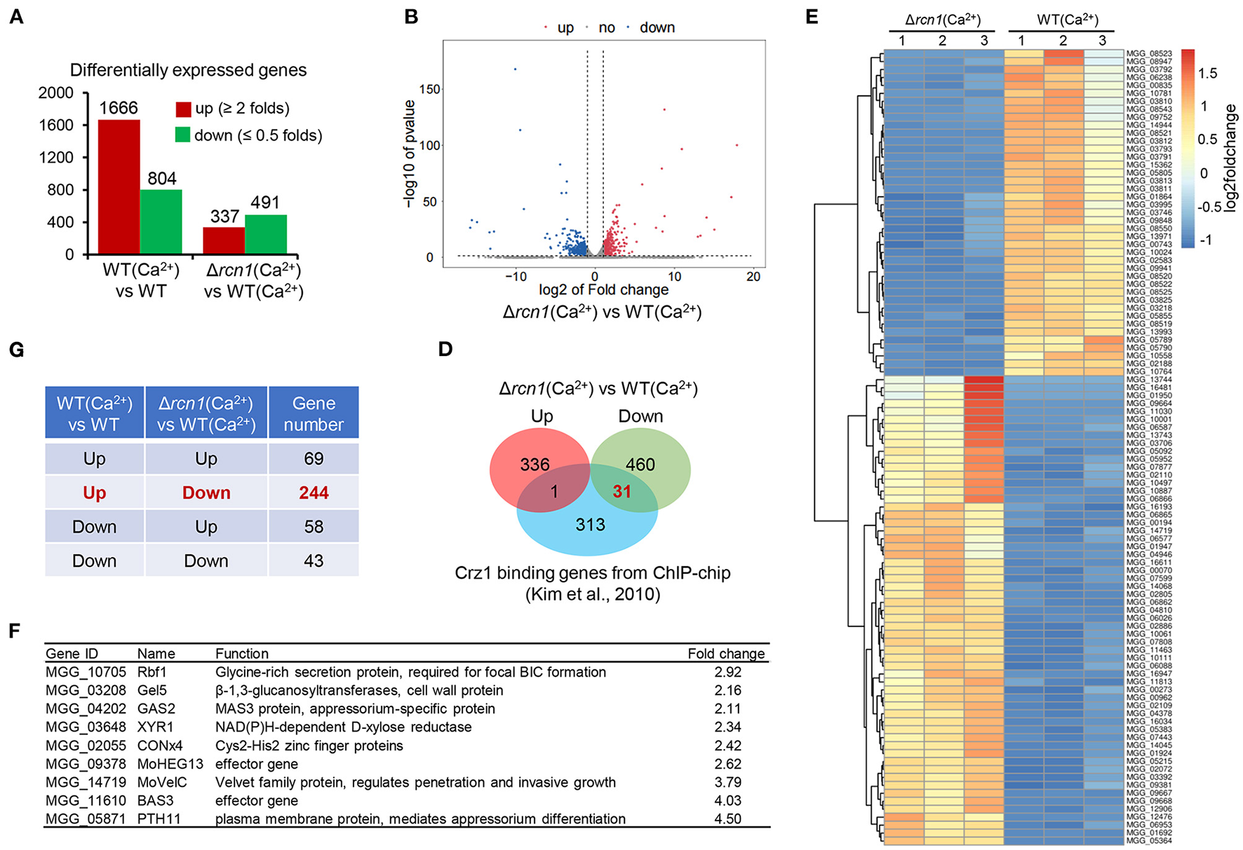 Figure 8. Integrative analysis of RNA-seq genes affected by calcium in WT and ΔMorcn1 mutants. (A) Differentially expressed genes of different comparing pairs obtained from RNAseq data. (B) Expression fold changes of genes in ΔMorcn1 induced by Ca2+ compared with WT induced by Ca2+ (|log2[FC]| > 1; p-adj <0.05). (C) Gene numbers shared in different comparing pairs of upregulated or downregulated genes in (A). (D) Overlap of MoRCN1-regulated and Crz1-regulated genes reported by Kim et al. (2010). (E) Heatmap shows hierarchical clustering of genes from transcriptome data. WT (Ca2+), the wild type strain induced by CaCl2; ΔMorcn1 (Ca2+), the ΔMorcn1 mutants induced by CaCl2. (F) Previously reported pathogenesis genes in differentially expressed genes of ΔMorcn1(Ca2+) compared with WT(Ca2+).