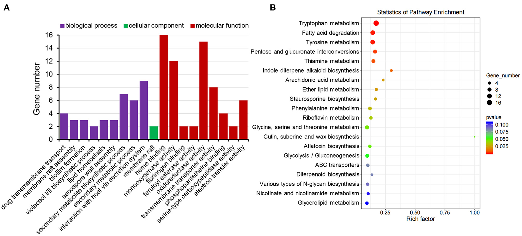 Gene Ontology (GO) enrichment analysis of differentially expressed genes showed that biological processes of interaction with the host via secretary system, secondary metabolic process, secondary metabolite biosynthesis, ascospore wall assembly, lipid homeostasis, membrane raft assembly, as well as transmembrane transport were significantly enriched, most of which were related to stress response. For cellular components, the membrane raft was enriched. For molecular function, heme binding, monooxygenase activity, oxidoreductase activity, and electron transfer activity were enriched (Figure 9A), most of which were related to energy metabolism. In sum, results of the GO enrichment analysis were consistent with the fact that the MoRCN1 is involved in response to different stresses.