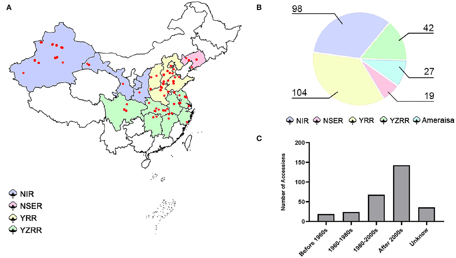 Map of the 290 cotton accessions. (A) Geographic distribution of the natural population; each accession is represented by a dot. (B) Pie chart of the proportions of diverse cotton-growing areas in 290 accessions. NIR: Northwest Inland region in China; NSER: Northern-Specific Early-Maturity region; YRR: Yellow River region; YZRR: Yangtze River region; and Amerasian: 27 accessions primarily introduced from six different countries (USA, Azerbaijan, Israel, Kyrgyzstan, Tajikistan, and Uzbekistan). (C) Breeding stage distribution of the GWAS panel; Unknown: accessions that were not found among the pedigrees.