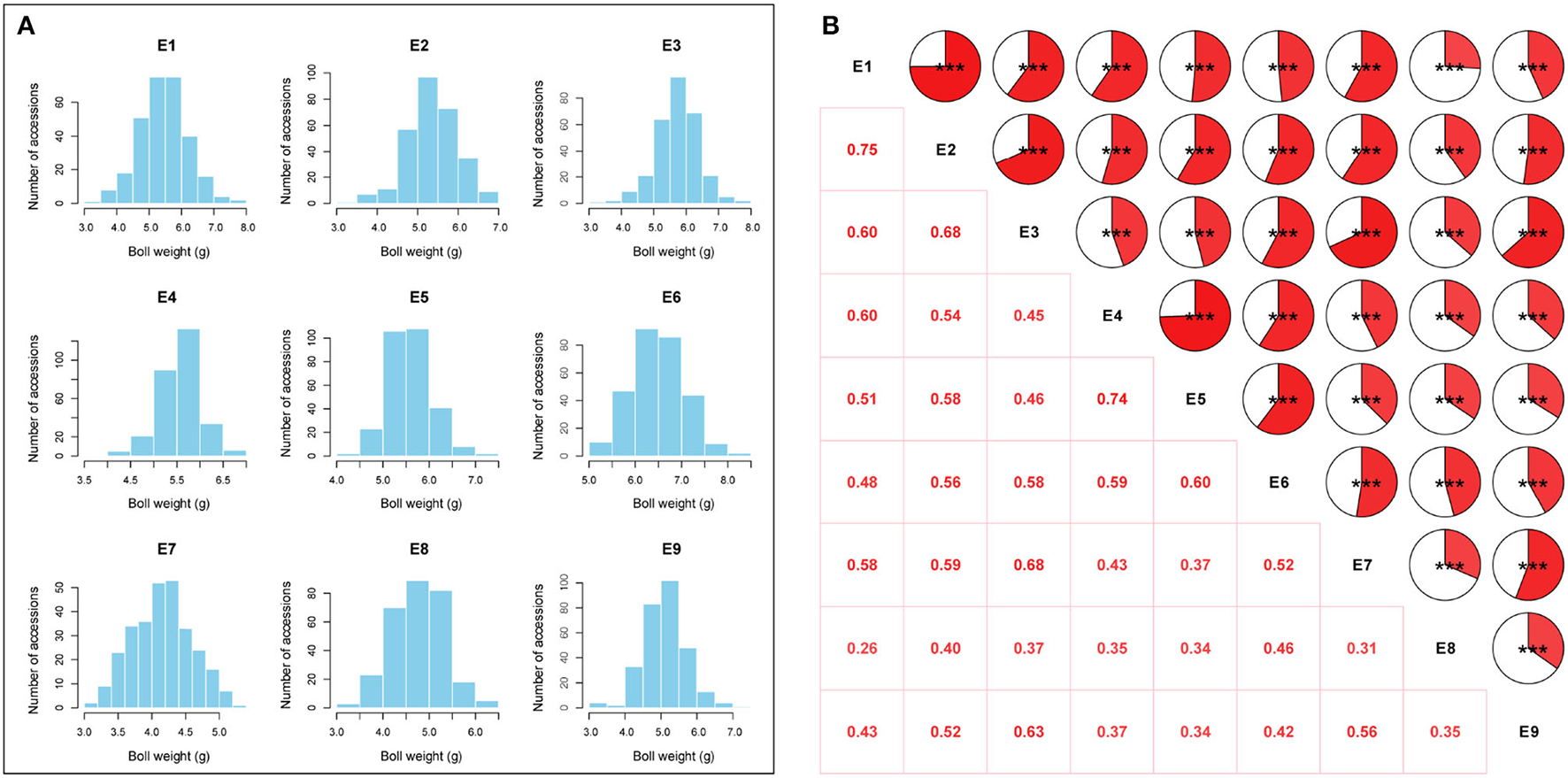 Phenotypic variation analysis of boll weight. (A) Distributions of the mean values for boll weight in nine environments (E1: Anyang-2014, E2: Anyang-2015, E3: Anyang-2016, E4: Shihezi-2014, E5: Shihezi-2015, E6: Shihezi-2016, E7: Huanggang-2016, E8: Huanggang-2021, and E9: Sanya-2020-2021). (B) Correlation analysis of boll weight in nine environments (***P < 0.001, **P < 0.01, and *P < 0.05).