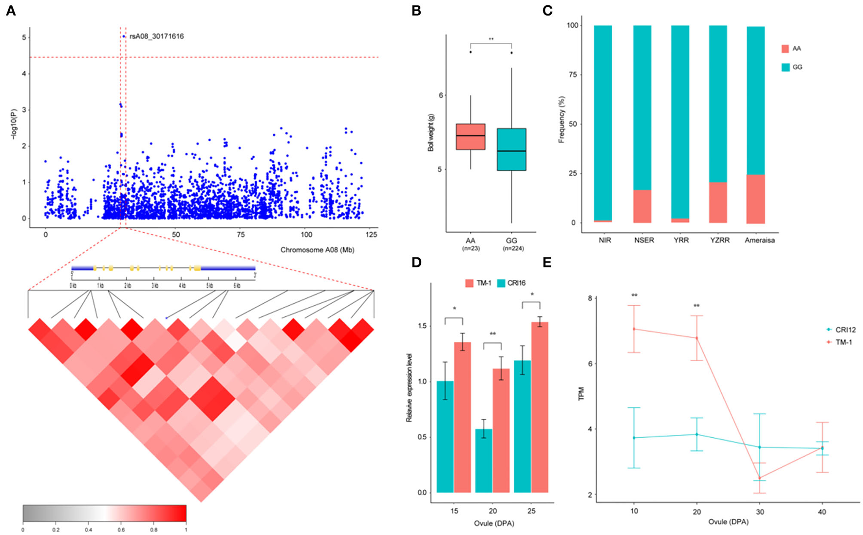 Variation analysis of the boll weight-related gene Ghir_A08G009110 on candidate region. (A) Local Manhattan plots for BW-related genes on chromosome A08 and LD heatmap for the candidate region within the peak region of rsA08_30171616, including the exon–intron structure of Ghir_A08G009110. (B) Box plots for BW between the two haplotypes mentioned above (** P < 0.01, * P < 0.05). (C) Differentiation of the genetic diversity distribution of the favorable haplotype for rsA08_30171616 in five geographic areas. (D) Expression level analysis of Ghir_A08G009110 between “TM-1” (red) and “CRI16” (green) during ovule developmental stages (15, 20, and 25 DPA) by qRT-PCR (** P < 0.01, * P < 0.05). (E) Expression abundance analysis of Ghir_A08G009110 between “TM-1” (red) and “CRI12” (green) during ovule developmental stages (10, 20, 30, and 40 DPA) by RNA-seq (** P < 0.01, * P < 0.05).