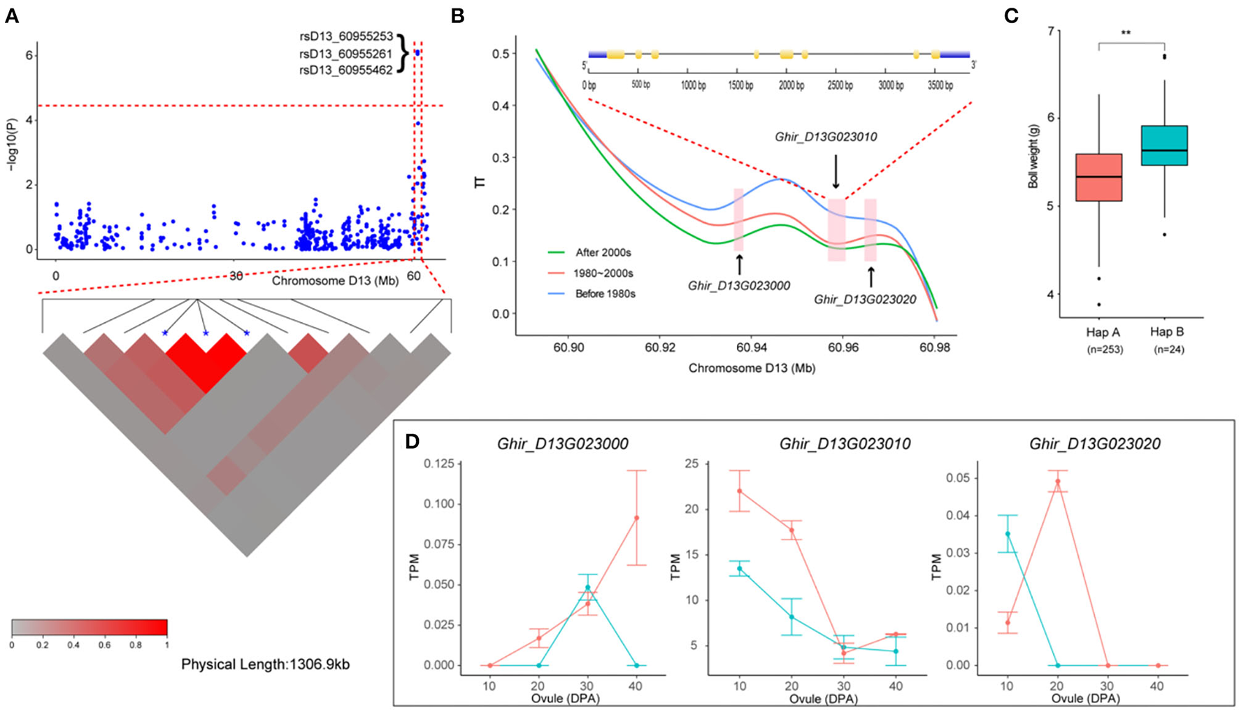 Variation analysis of the boll weight-related gene Ghir_D13G023010 on candidate region. (A) Local Manhattan plots for BW-related genes on chromosome D13 and LD heatmap for the candidate region within the peak region of rsD13_60955253, rsD13_60955261, and rsD13_60955462. (B) Genetic diversity across the three populations and exon–intron structure of Ghir_D13G023010. (C) Box plots for BW of the two haplotypes mentioned above (** P < 0.01, * P < 0.05). (D) Expression abundance analysis of Ghir_D13G023010 between “TM-1” (green) and “CRI12” (red) during ovule developmental stages (0, 10, 20, 30, and 40 DPA) by RNA-seq.