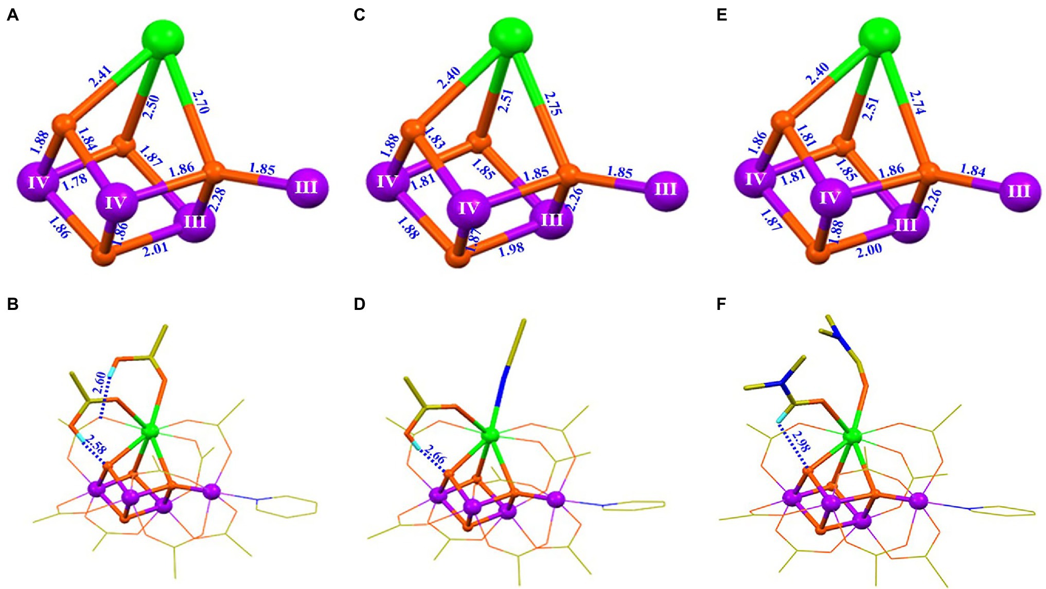 Figure 4. Structures of three artificial complexes containing Mn3XO4 cubane (X = Ca/Sr). (A) Core of the Mn3CaO4-complex (1); (B) Structure of the Mn3CaO4-complex (1) (Kanady et al., 2011); (C) Core structure of the Mn3Ca2O4-complex (2); (D) Structure of the Mn3Ca2O4-complex (2) (Mukherjee et al., 2012); (E) Core of the (Mn3SrO4)2O-complex (3); (F) Structure of the (Mn3SrO4)2O-complex (3) (Chen et al., 2014). Distances are given in Å units; Mn, Ca, Sr., O, N, and C are shown in purple, green, cyan, orange, blue, and yellow, respectively. For clarity, all hydrogen atoms are not shown.