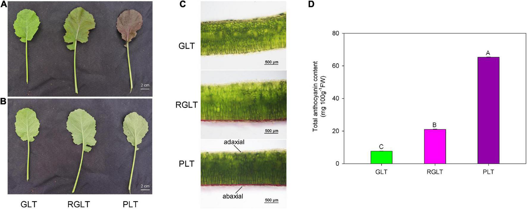 Figure 1. Leaf morphology and total anthocyanin content in three B. napus varieties. (A) Upper epidermis of green leaf type (GLT), reddish-green leaf type (RGLT), and purple leaf type (PLT). Scale Bars = 2 cm. (B) Lower epidermis of GLT, RGLT, and PLT. (C) Transverse section of GLT, RGLT, and PLT. Scale Bars = 500 μm. (D) Total anthocyanin contents in GLT, RGLT, and PLT. The different capital letters indicate significant differences at P ≤ 0.01.