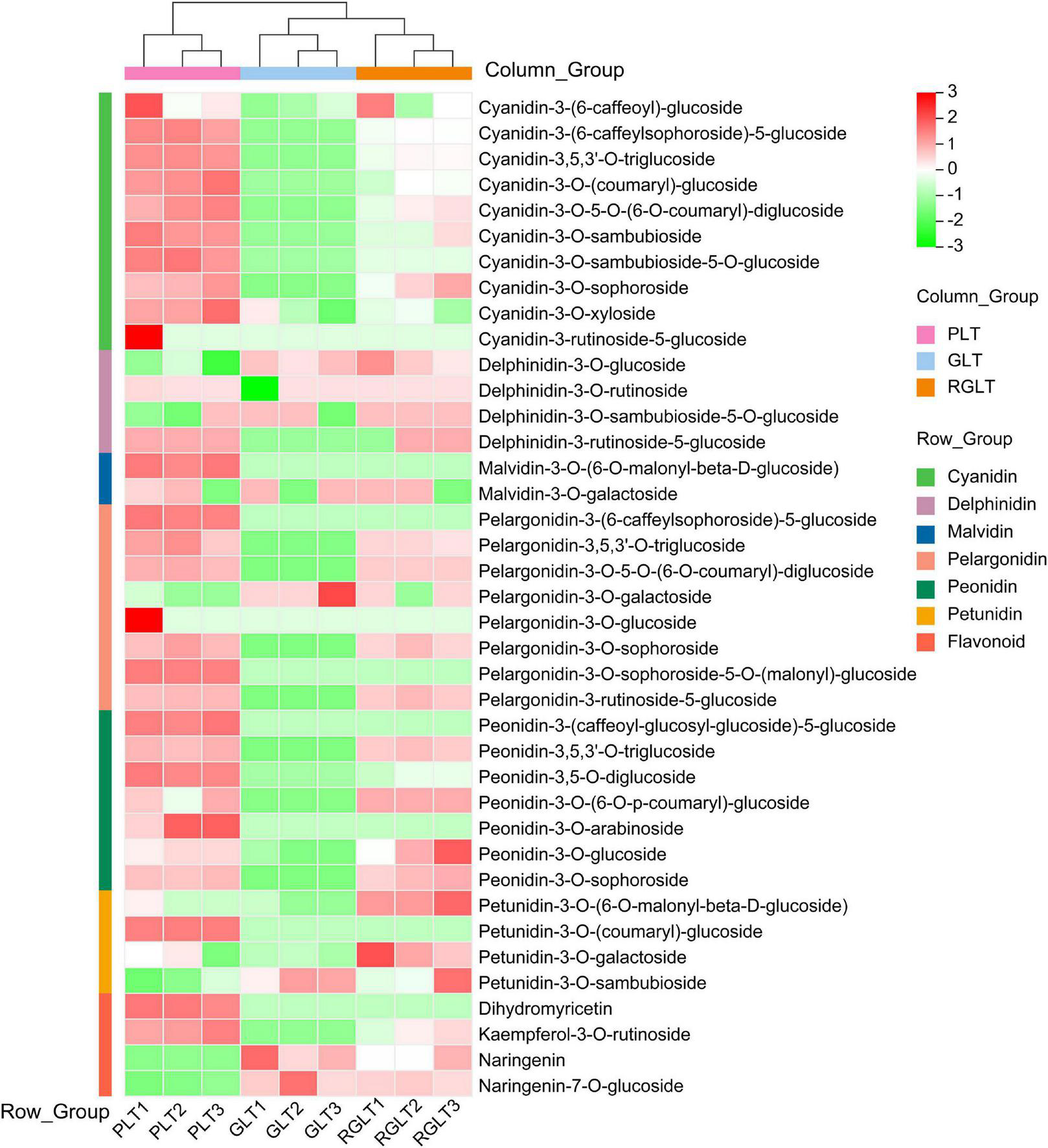 Figure 2. Heatmap of anthocyanin metabolites in the three different colored leaves of B. napus. PLT, purple leaf type; GLT, green leaf type; RGLT, reddish-green leaf type. GLT, green leaf type; RGLT, reddish-green leaf type; PLT, purple leaf type.