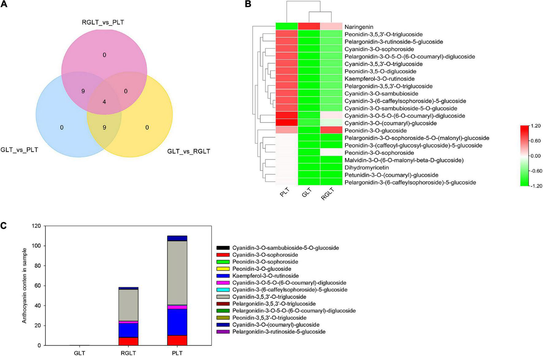 Figure 3. Metabolome analysis of differentially accumulated metabolites (DAMs). (A) Venn diagram analysis among GLT vs. PLT, GLT vs. RGLT, and RGLT vs. PLT. (B) Cluster heat map of DAMs among GLT, RGLT, and PLT. (C) The relative content of overlapping DAMs (four anthocyanins) in the leaves of the three B. napus cultivars.