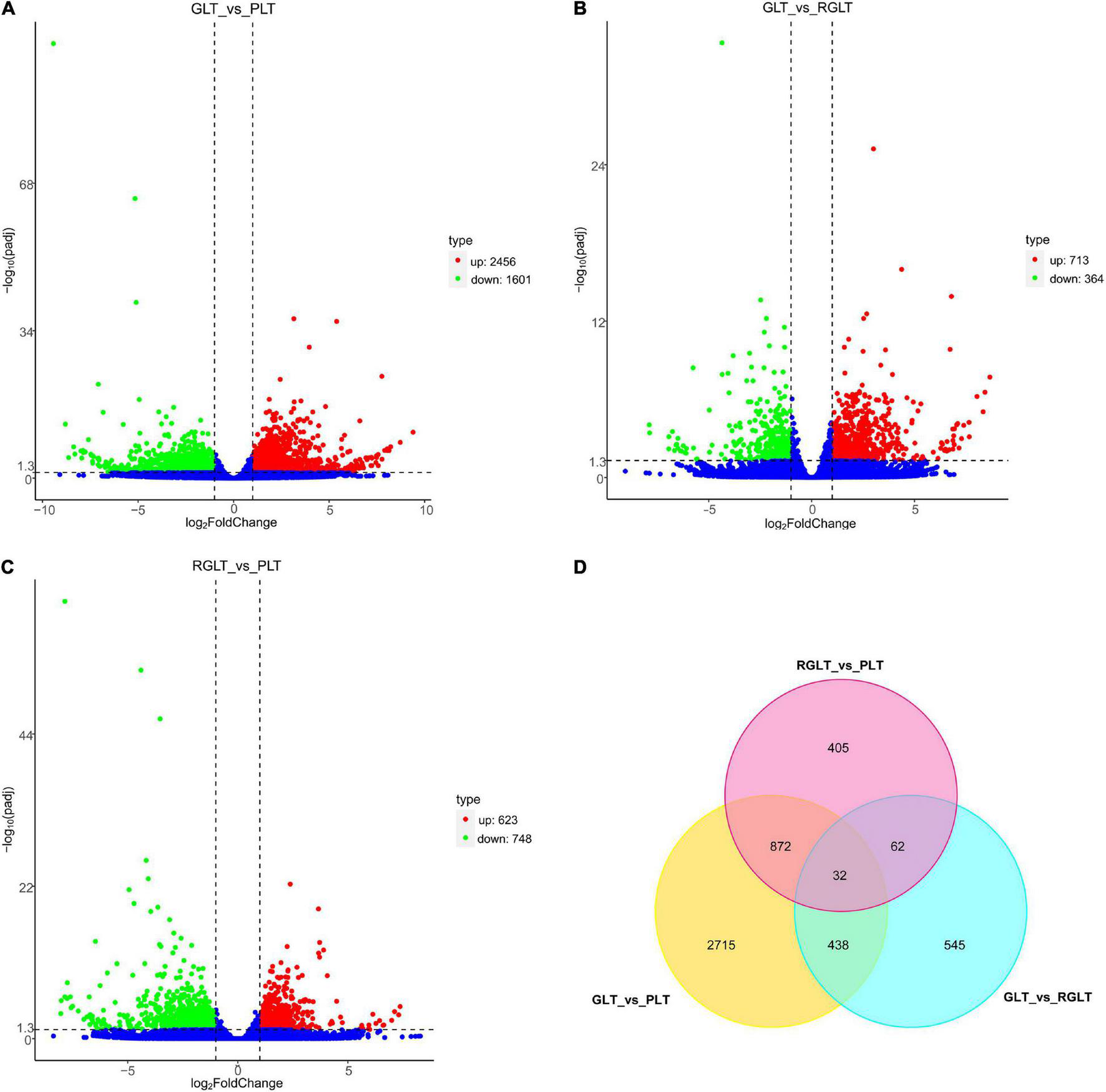 Figure 4. Volcano map and Venn diagram analysis of differentially expressed genes (DEGs) in the different colored leaves of B. napus. Red dots indicate upregulated DEGs, green dots indicate downregulated DEGs, and blue dots indicate genes that were not differentially expressed. (A–C) Volcano map of DEGs among GLT vs. PLT, GLT vs. RGLT, and RGLT vs. PLT. (D) Venn diagram analysis of DEGs among GLT vs. PLT, GLT vs. RGLT, and RGLT vs. PLT.