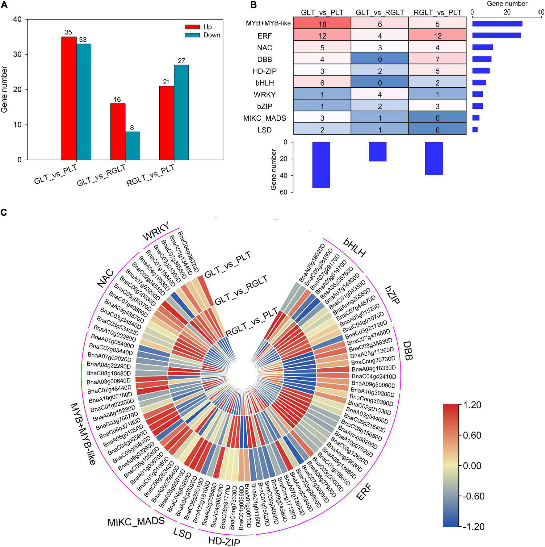 Figure 6. Distinct expression patterns of transcription factors (TFs). (A) Number of differentially expressed TFs in the GLT, RGLT, and PLT groups. (B) Overview of the enriched TF family. The histograms show the number of genes belonging to each TF family or in each B. napus variety. (C) Heatmaps represent the expression fold change (Log2FC) of TFs among GLT, RGLT, and PLT groups.