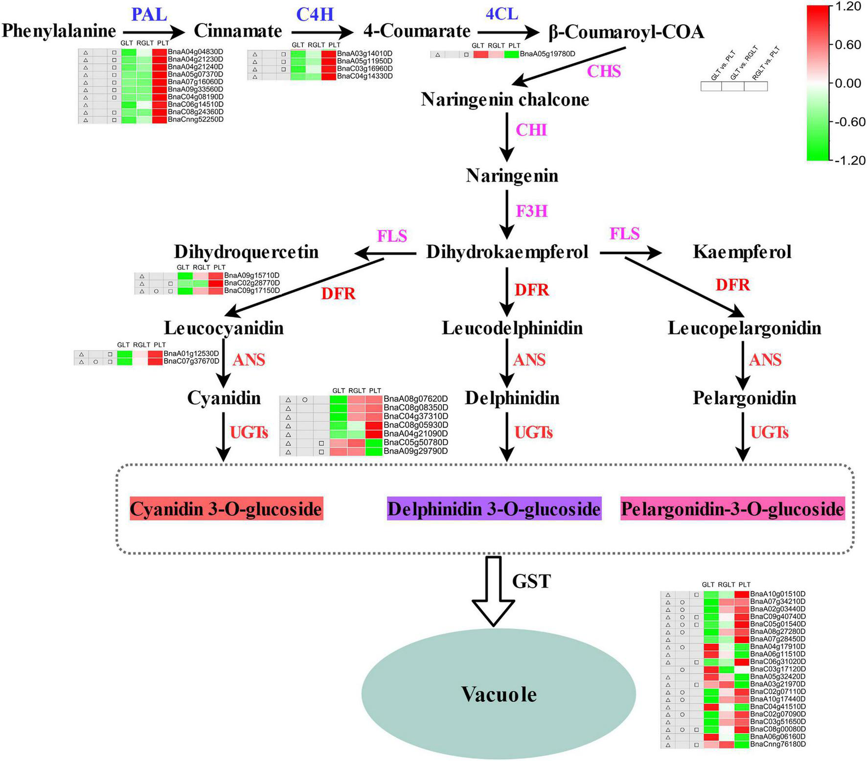 Petunidin, delphinidin, pelargonidin, cyanidin, peonidin, and malvidin were present in GLT. The contents of petunidin-3-O-galactoside and delphinidin-3-O-glucoside were nearly equal in the GLT, RGLT, and PLT groups (Figure 2 and Supplementary Table 2), which is consistent with the results of Salvia miltiorrhiza flowers reported by Jiang et al. (2020) and turnip skins reported by Zhuang et al. (2019). However, the pigments detected in purple flowers of alfalfa were absent in the cream flowers (Duan et al., 2020). In plants, color is based on the number of pigments, metal ions, or different molecular conformations of anthocyanins (Jiang et al., 2020). These pigments are typically present in small quantities in the green leaves of B. napus, thereby indicating that structural genes of anthocyanin metabolic pathways may be expressed at the low levels in the green leaves of B. napus.