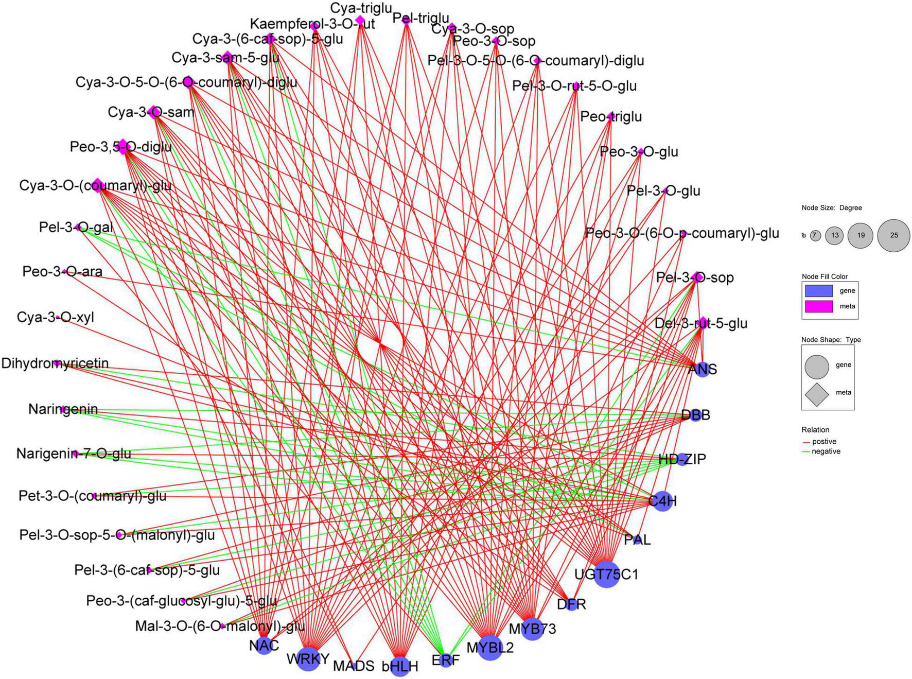 Figure 8. Correlation network of 30 metabolites and 14 key genes involved in flavonoid and anthocyanin biosynthesis in B. napus leaves. Blue circle and pink diamond represent genes and metabolites, respectively. The degree represents the number of genes or metabolites. Relation represents the correlations with the coefficient value ≥ 0.80 (positive) or ≤ –0.80 (negative). Cya-3-O-xyl, cyanidin-3-O-xyloside; Cya-3-O-(coumaryl)-glu, cyanidin-3-O-(coumaryl)-glucoside; Cya-3-O-5-O-(6-O-coumaryl)-diglu, cyanidin-3-O-5-O-(6-O-coumaryl)-diglucoside; Cya-3-O-sam, cyanidin-3-O-sambubioside; Cya-3-sam-5-glu, cyanidin-3-O-sambubioside-5-O-glucoside; Cya-3-(6-caf-sop)-5-glu, cyanidin-3-(6-caffeylsophoroside)-5-glucoside; Cya-3-O-xyl, cyanidin-3-O-xyloside; Cya-3-O-sop, Cyanidin-3-O-sophoroside; Cya-triglu, cyanidin-3,5,3’-O-triglucoside; Del-3-rut-5-glu, delphinidin-3-rutinoside-5-glucoside; Kaempferol-3-O-rut, kaempferol-3-O-rutinoside; Mal-3-O-(6-O-malonyl)-glu, malvidin-3-O-(6-O-malonyl-beta-D-glucoside); Pel-3-O-sop-5-O-(malonyl)-glu, pelargonidin-3-O-sophoroside-5-O-(malonyl)-glucoside; Pel-3-O-gal, pelargonidin-3-O-galactoside; Pel-3-(6-caf-sop)-5-glu, pelargonidin-3-(6-caffeylsophoroside)-5-glucoside; Pel-3-O-sop, pelargonidin-3-O-sophoroside; Pel-3-O-5-O-(6-O-coumaryl)-diglu, pelargonidin-3-O-5-O-(6-O-coumaryl)-diglucoside; Pel-triglu, pelargonidin-3,5,3’-O-triglucoside; Pel-3-O-rut-5-O-glu, pelargonidin-3-rutinoside-5-glucoside; Peo-3,5-O-diglu, peonidin-3,5-O-diglucoside; Peo-3-O-ara, peonidin-3-O-arabinoside; Peo-3-(caf-glucosyl-glu)-5-glu, peonidin-3-(caffeoyl-glucosyl-glucoside)-5-glucoside; Pet-3-O-(coumaryl)-glu, petunidin-3-O-(coumaryl)-glucoside; Naringenin-7-O-glu, naringenin-7-O-glucoside; Peo-3-O-sop, peonidin-3-O-sophoroside; Peo-triglu, peonidin-3,5,3’-O-triglucoside; Peo-3-O-glu, peonidin-3-O-glucoside; Pel-3-O-glu, pelargonidin-3-O-glucoside; Peo-3-O-(6-O-p-coumaryl)-glu, peonidin-3-O-(6-O-p-coumaryl)-glucoside.