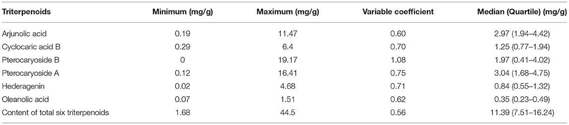 The C. paliurus leaves were collected from 316 individual trees of 26 different population (Table 2), and the total triterpenoid content ranged from 1.68 to 44.50 mg/g (the median, 11.39 mg/g) and was the sum of six compounds: arjunolic acid (2.97 mg/g), pterocaryoside B (1.25 mg/g), pterocaryoside A (1.97 mg/g), cyclocaric acid B (3.04 mg/g), hederagenin (0.84 mg/g), and oleanolic acid (0.35 mg/g). Among them, the variable coefficient ranged from 0.56 to 1.08, cyclocaric acid B (0.70), pterocaryoside B (1.08), pterocaryoside A (0.75), and hederagenin (0.71) exhibit higher variable coefficient, while arjunolic acid (0.60), oleanolic acid (0.62), and total six triterpenoids (0.56) exhibit lower.