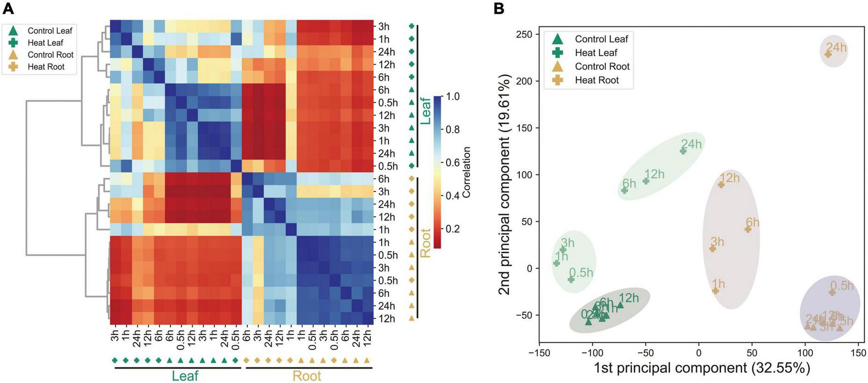 Figure 1. Summary of the transcriptomics data. (A) Hierarchical clustering analysis of 35,336 genes from 24 samples. Color scale represents Pearson’s correlation coefficient (0–1). (B) PCA of the leaf and root transcriptomes from the control and heat-treated samples.