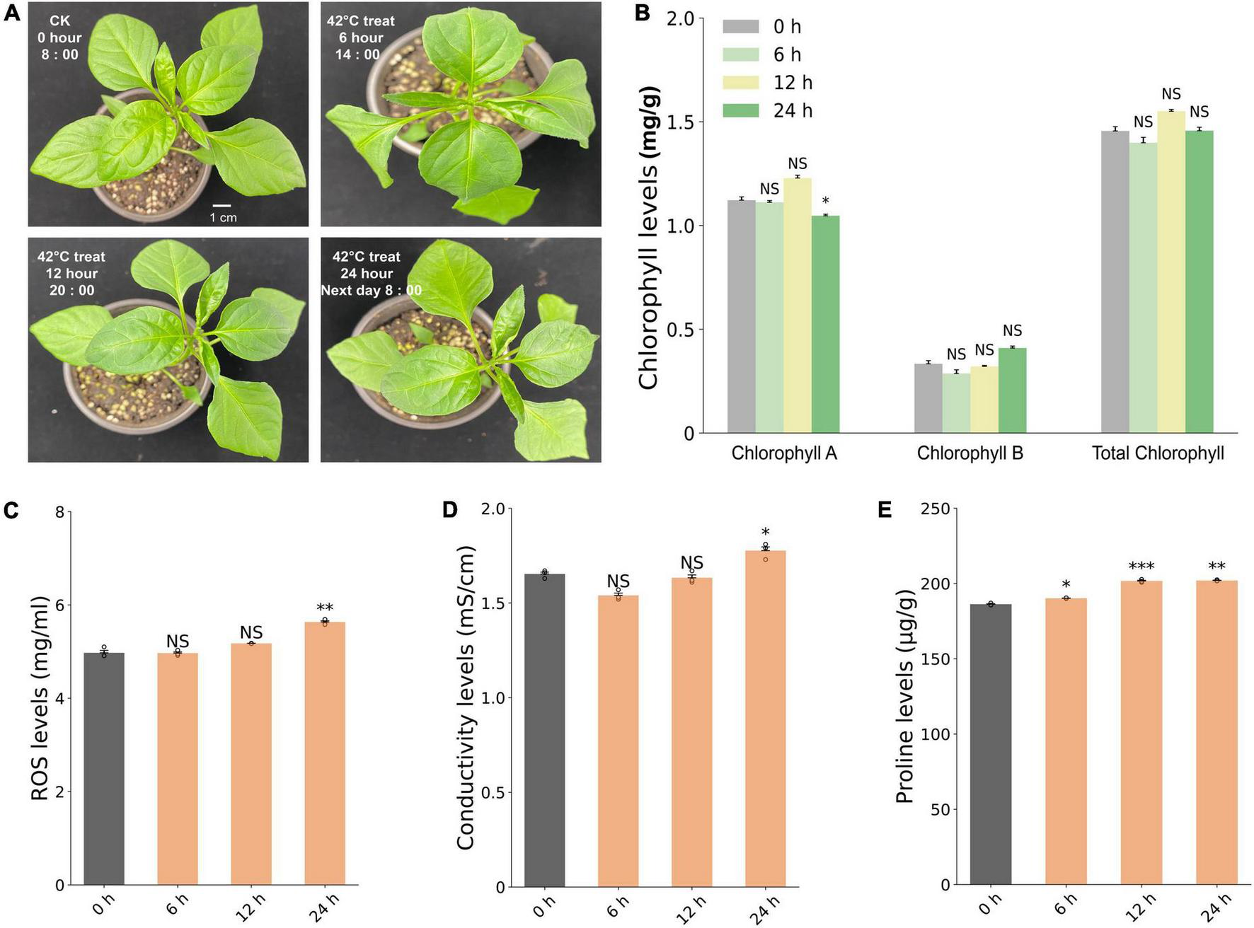 Figure 2. Phenotypic and physiological responses of pepper line 6421 under 42°C heat stress. (A) Seedlings of control (0 h) and heat (6, 12, and 24 h at 42°C) treatments. Changes in the content of chlorophyll including chlorophyll A, chlorophyll B, and total chlorophylls (B), the content of ROS (C), conductivity (D), and the content of proline (E). Student’s t-test was conducted to compare each heat treatment time point with the 0-h control treatment. Stars indicate significance with one, two, and three stars representing significance at *P < 0.05, **P < 0.01, and ***P < 0.001, respectively. NS: no significant difference. Error bar represents the standard deviation of each mean (n = 3).