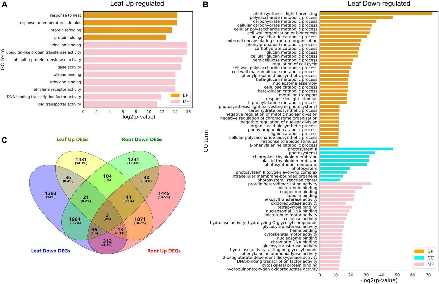 Figure 6. Gene ontology (GO) analysis of differentially expressed genes (DEGs) under heat stress. (A) Upregulated DEGs in the leaf. (B) Downregulated DEGs in the leaf. (C) Venn diagrams showing DEGs in the leaf and root. GO terms with FDR < 0.01 are shown. The full lists of DEGs and GO terms can be found in Supplementary Tables 6, 7.