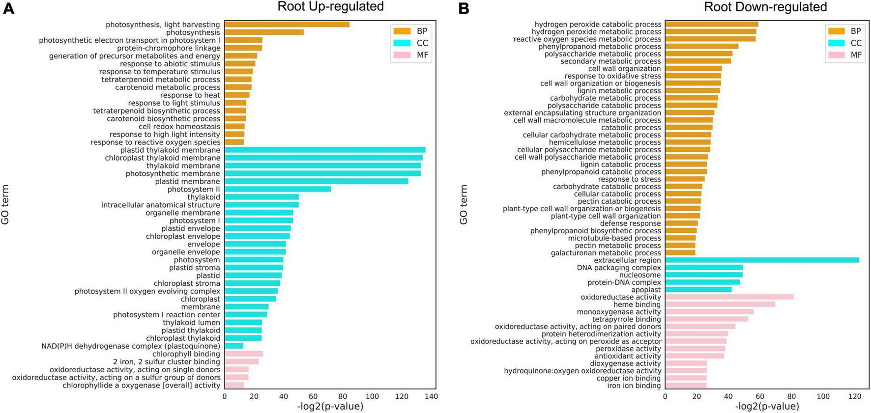 Figure 7. Gene Q20 ontology (GO) analysis of differentially expressed genes (DEGs) under heat stress. (A) Upregulated DEGs in the root. (B) Downregulated DEGs in the root. GO terms with FDR < 0.01 are shown. CC: cellular component; MF: molecular function; BP: biological process. The full lists of DEGs and GO terms can be found in Supplementary Tables 8, 9.