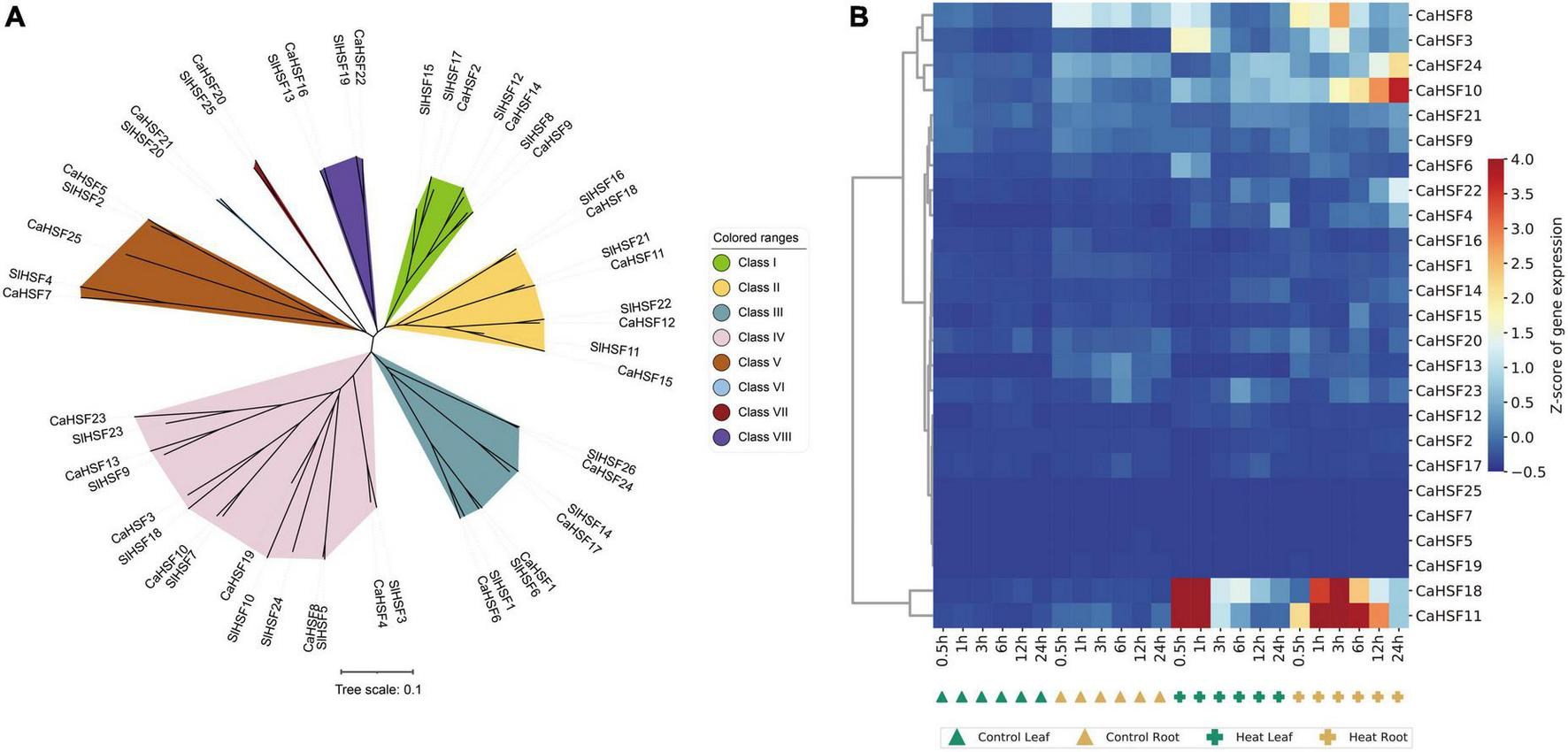 Figure 9. Phylogeny and gene expression of HSFs. (A) Phylogenetic analysis of tomato and pepper HSF proteins shows that they can be grouped into eight classes. (B) Heatmap showing the temporospatial expression of CaHSFs.