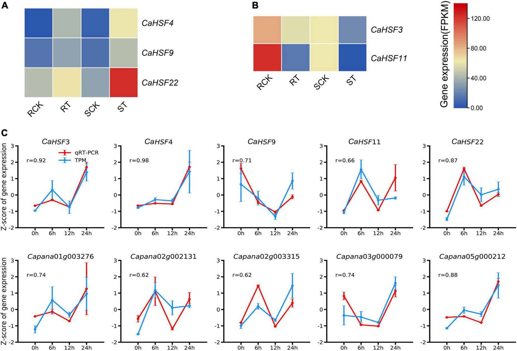 Figure 10. Expression of selected key genes in different pepper varieties. (A,B) Expression of CaHSFs in heat-tolerant variety 17CL30 and heat-susceptible variety 05S180 after treated at 40°C for 28 h. RCK: control 17CL30; RT: treated 17CL30; SCK: control 05S180; ST: treated 05S180. (C) RNA-Seq and qRT-PCR data of the expression profiles of ten selected genes in pepper line 6421 leaves after treated at 42°C for 0, 6, 12, and 24 h. Error bars represent the standard deviation (n = 3). r = Pearson’s(r) correlation coefficient to describe the correlation between normalized expression values measured by RNA-Seq and qRT-PCR (normalized relative to CaUBI3).