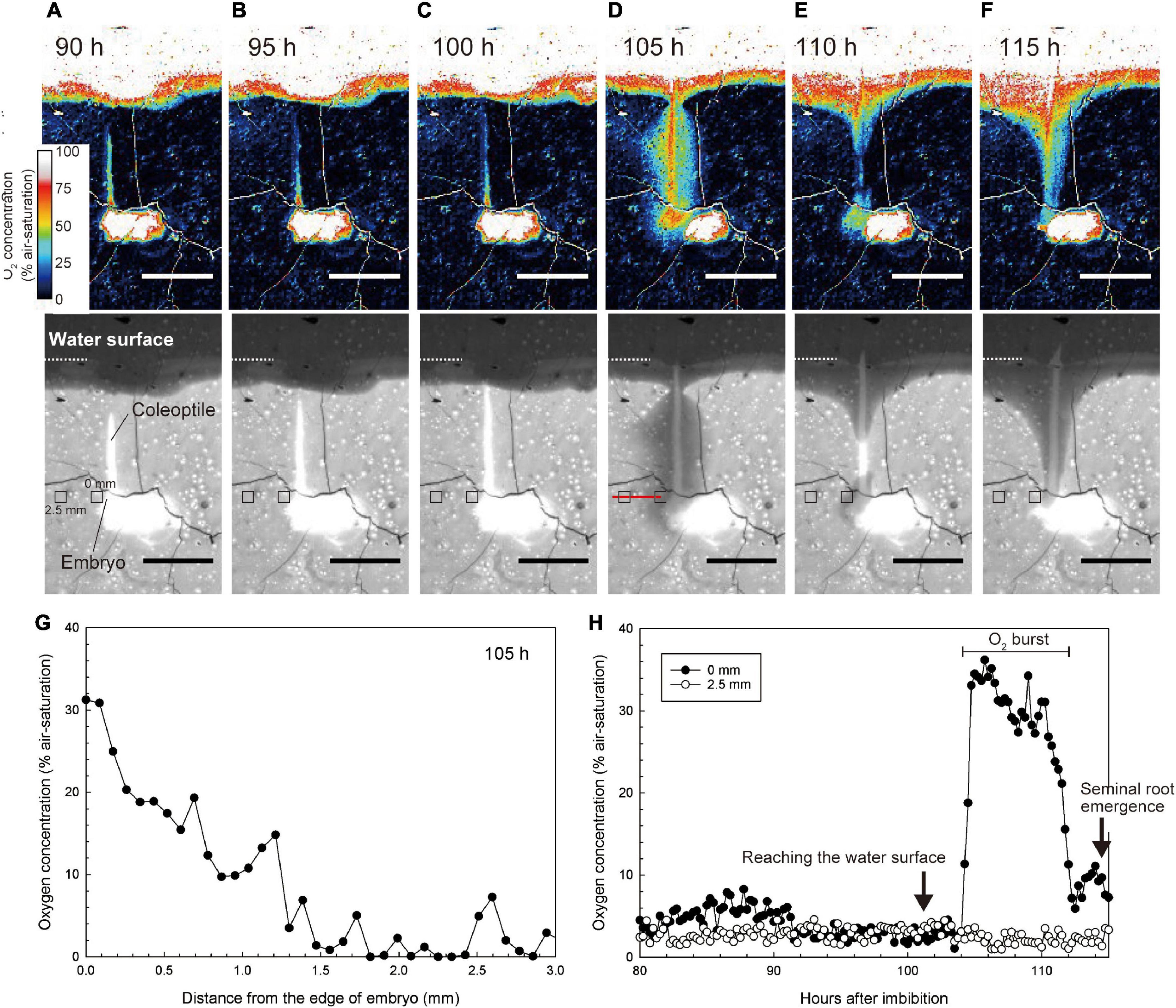 Figure 4. Spatiotemporal O2 dynamics under normoxic atmosphere. (A–F) An image sequence of the submerged germination process as recorded by the planar O2 optode system. Bars = 10 mm. Upper color images are O2 concentration images. Lower monochrome images are red images to visualize the growth of coleoptile. At the 101 h after imbibition, the coleoptile tip reached the water surface. The coleoptile tip was submerged in (A–C) or above water in (D–F). Note: the O2 value on the seeds and the coleoptile erroneously appear constantly high (i.e., over 50–100% air-saturation) due to a scattering artifact reflecting the white colors of seeds and coleoptiles. (G) O2 gradient toward the embryo at 105 h after imbibition (i.e., along the red line in the lower panel of D) when a transient O2 burst was observed at 105 h after imbibition. (H) Dynamics of O2 concentration at 0 mm and 2.5 mm from the embryo (e.g., small squares in the lower panels of A–F). The sequence of O2 images during submerged germination is shown in Supplementary Video 3.