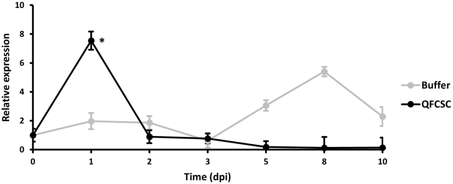 To further confirm the expression pattern of the TaMYC4 genes observed in the pilot study (data not shown), we conducted a time-course study in Alpowa, the genetic background of the NILs used in the wheat-Pt transcriptomics pilot study. Alpowa was inoculated with Pt race PBJJG and Pgt race QFCSC or buffer Soltrol 170 isoparaffin as a mock inoculated control. An RNA collection time course was set at 0-, 1-, 2-, 3-, 4-, 5-, 8-, and 10-days post-inoculation (dpi). The expression level of TaMYC4 was assayed via qRT-PCR using the BN4RT primers that measured all three homeologs of the TaMYC4 genes (Supplementary Table 1, Supplementary File 1). We did not observe any significant changes in the expression profile of TaMYC4 at any of the time points for the PBJJG-inoculated Alpowa (Supplementary Figure 2). When Alpowa was inoculated with the Pgt race QFCSC, the expression levels of TaMYC4 were similar in samples taken at 0 dpi between Pgt-inoculated Alpowa and the control. However, a significant increase in TaMYC4 transcript abundance was detected at 1 dpi in Pgt infected Alpowa compared to the control plants. The TaMYC4 expression level returned to an undetectable level at 2 dpi and stayed unchanged during the rest of the time points (Figure 1). The expression level of TaMYC4 in buffer inoculated Alpowa showed minor and insignificant changes along from 1 to 3 dpi but showed an increase from 5 to 8 dpi that then declined at 10 dpi. This increase was, however, statistically insignificant. A significantly higher expression of TaMYC4 occurred after rust infection and only in the susceptible host revealed in the pilot study. These observations encouraged us to investigate whether Pgt-induced TaMYC4 upregulation is beneficial to the pathogen during colonization of wheat.