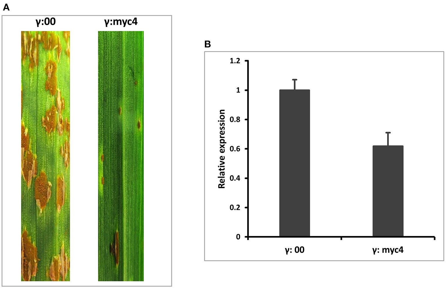 BSMV-VIGS of TaMYC4 in wheat cultivar Chinese Spring (CS). The first leaf of each plant was rub inoculated with the indicated BSMV constructs at the two-leaf stage and then spray inoculated with Pgt race QFCSC at 10 days after BSMV inoculation. The disease was assessed and photographed at 14 dpi. CS without any viral inoculation, used as a rust inoculation control; γ:00, CS inoculated with BSMV: MYC4; γ:myc4. RNA was extracted from viral-free leaf samples taken from γ:00 and γ:myc4 plants prior to pathogen inoculation. Transcript abundance was quantified via RT-qPCR. Error bars represent standard deviation among three biological reps. (A) Infection types of MYC4-silenced plants (B) Relative expression of TaMYC4 in γ:00 and γ:myc4 silenced plants.