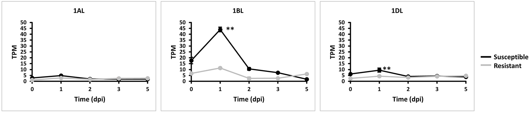 Expression of TaMYC4 (1AL, 1BL and 1DL) homeologs during stripe rust–Avocet Yr5 (resistant) and Vuka (susceptible) interactions. TPM is transcript per million. Error bars represent standard deviation among three biological reps and ** denote statistical significance at the P ≤ 0.01 levels calculated between each time point and 0 dpi.