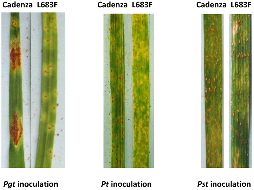 Reactions of the wild-type Cadenza and the TaMYC4 mutant L683F after inoculation with Puccinia graminis f. sp. tritici (Pgt), P. triticina (Pt) and P. striiformis f. sp. tritici (Pst) inoculation. Infection types (IT) of Cadenza: L683F in each pair of images were, Pgt (4: 1+), Pt (3: 2-;) and Pst (4: 3c) Photos of Pgt and Pst inoculated plants were taken 14 days post inoculation. Photos of Pt inoculated plants were taken 9 days post inoculation.