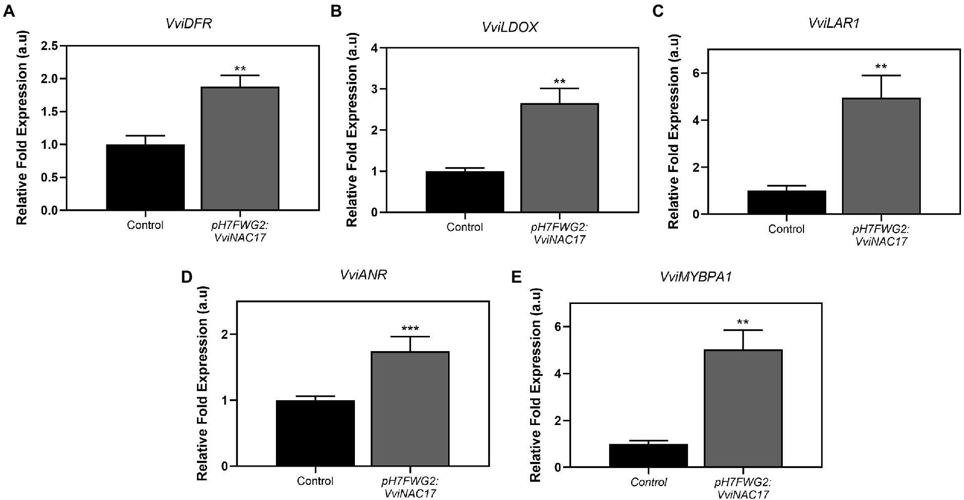 Figure 7. Stimulatory effect of the overexpression of VviNAC17 in the transcript levels of grapevine dihydroflavonol-4-reductase (VviDFR) (A), leucoanthocyanidin dioxygenase (VviLDOX) (B), leucoanthocyanidin reductase 1 (VviLAR1) (C), anthocyanidin reductase (VviANR) (D) and VviMYBPA1 (E). VviDFR, VviLDOX, VviLAR1, VviANR and VviMYBPA1 relative expression levels in non-transformed (control) and VviNAC17-overexpressing Gamay cells were obtained after normalization with the expression of the reference genes VviACT1 and VviGAPDH. Values are presented as mean ± SD of three biological replicates. Asterisks indicate statistical significance (Student’s t-test; **p ≤ 0.01).