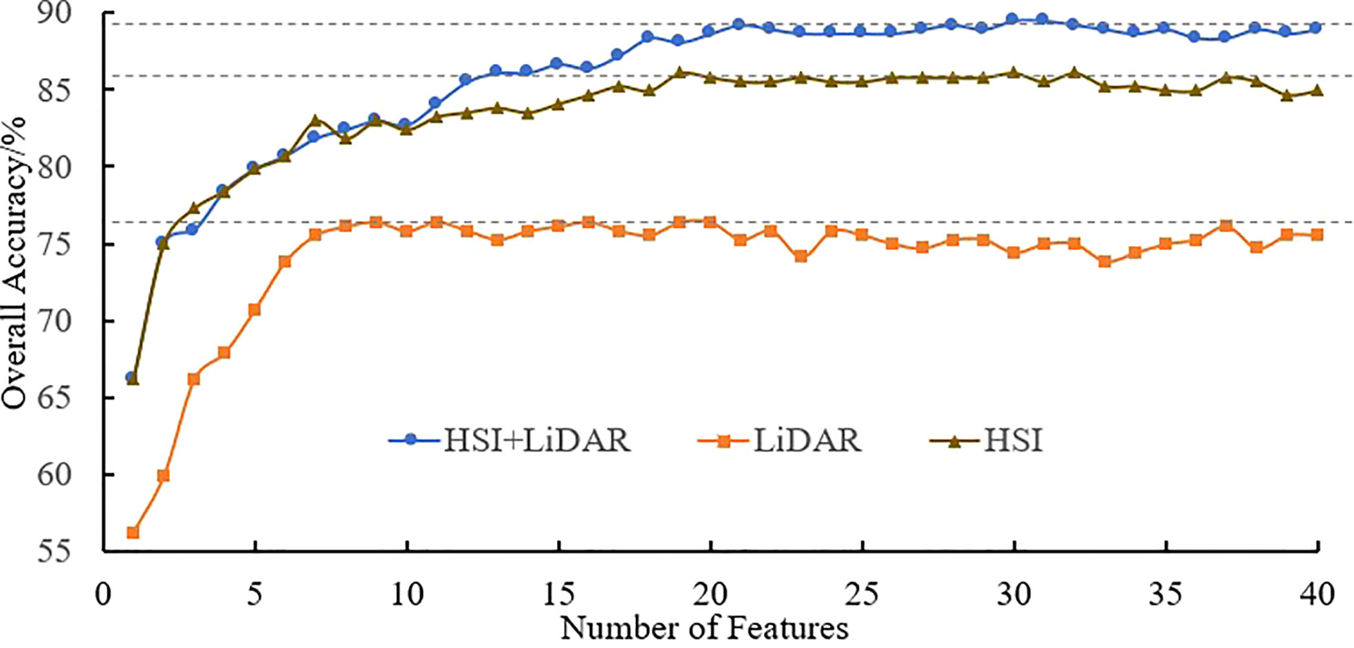 Based on the SVM algorithm, the three types of data features, namely, HSI, LiDAR and HSI+LiDAR, were modeled and subjected to the identification process by gradually increasing the number of features from 1 to 40 according to their relative importance. The variation tendency of accuracy based on multiple (120 times) identification results of tree species is shown in Figure 7.