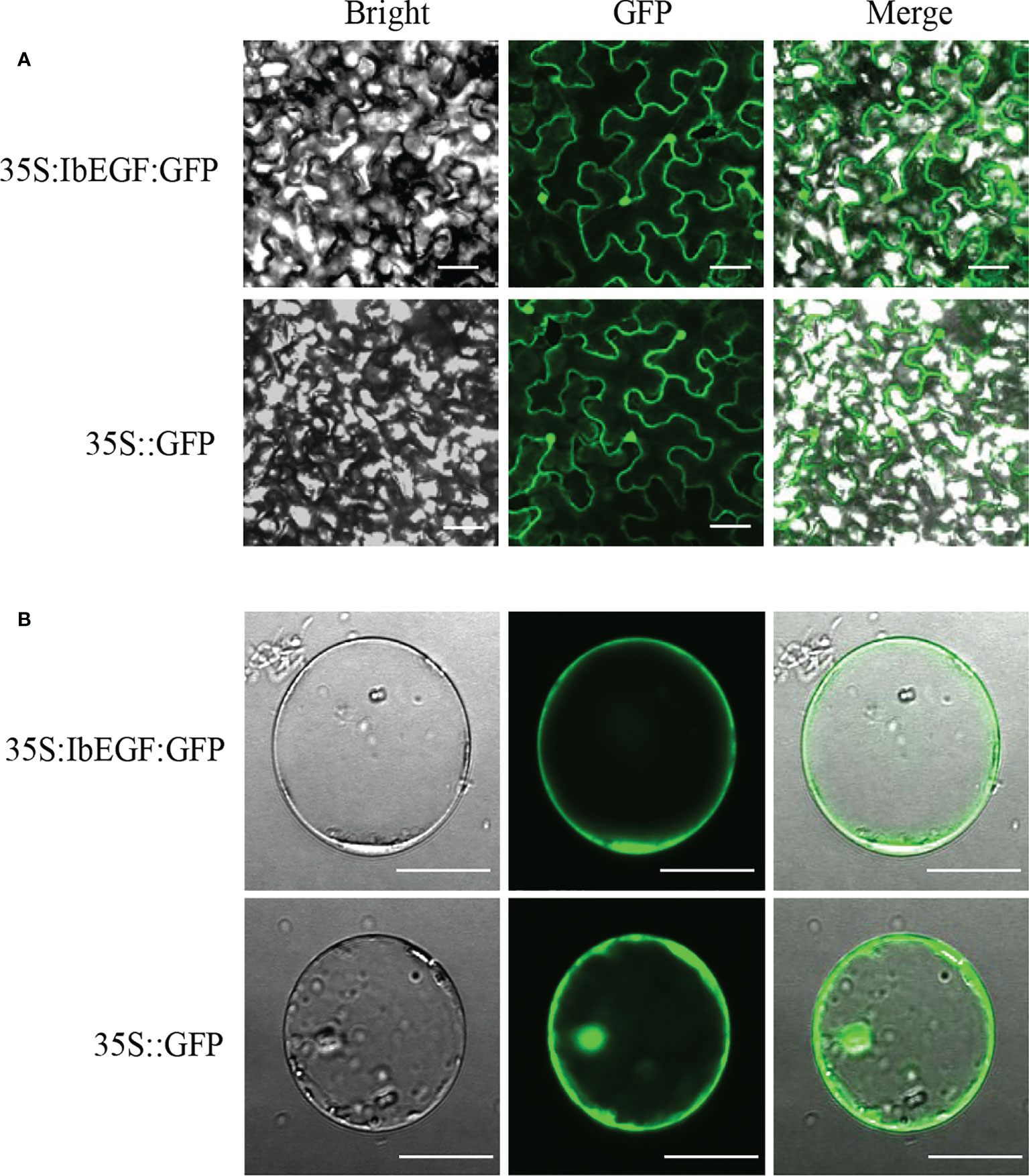 Figure 2 Subcellular localization of IbEGF in tobacco leaf hypodermal cells (A) and maize protoplasts (B). Confocal scanning microscopy images showing the localization of IbEGF-GFP to nucleus and cell membrane. The empty pSuper1300 vector (35S:GFP) was used as a control. Bars = 20 μm.
