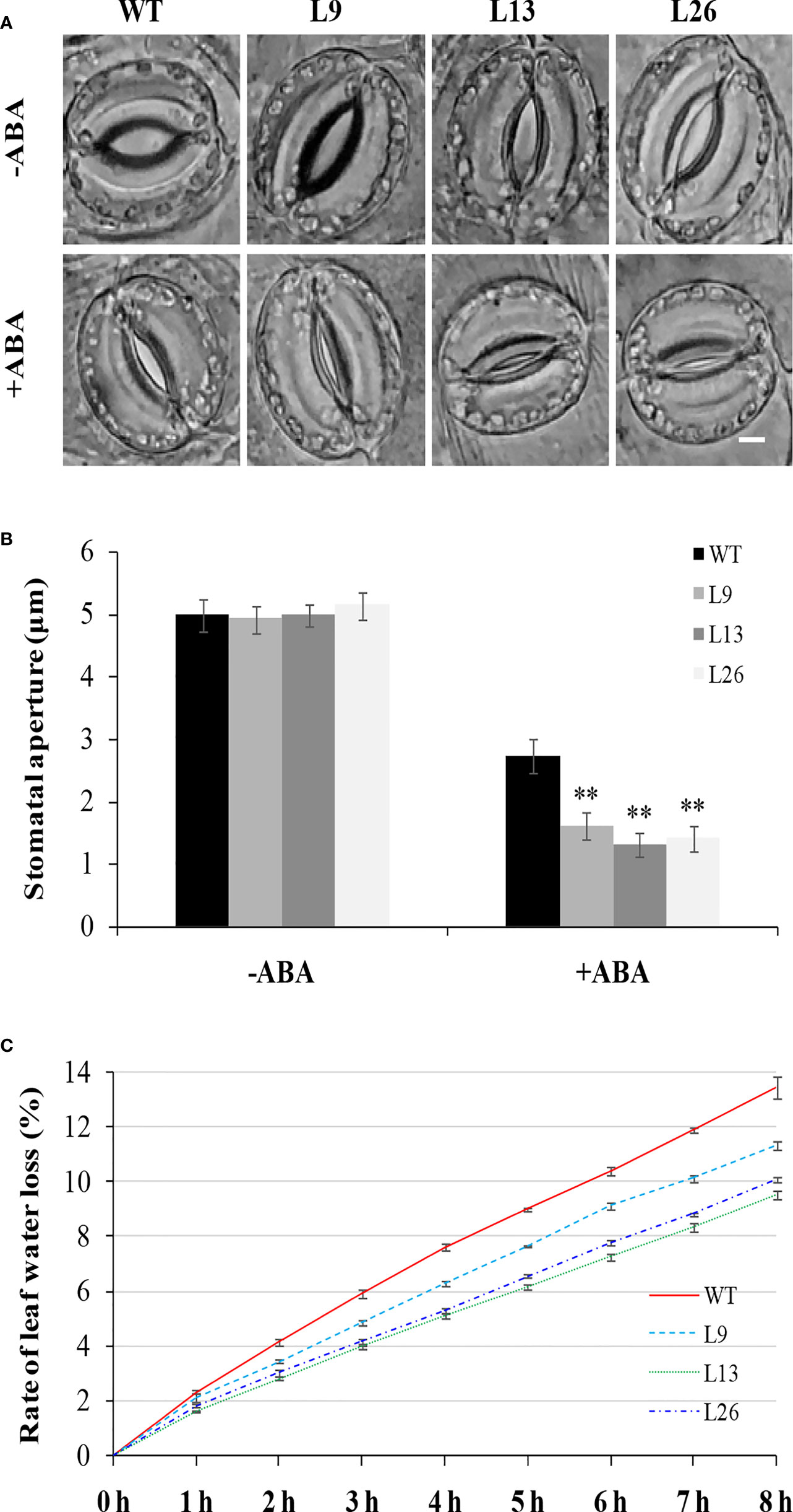 Figure 6 Stomatal aperture and leaf water loss rate of transgenic sweet potato plants and WT. (A, B) Stomatal aperture of greenhouse-grown plants under normal condition (-ABA) and treated with 20 μM ABA for 2 h. Bar = 5 μm. Data are presented as the means ± SD (n = 80). ** indicates significant difference from that of WT at P<0.01, according to Student’s t-test. (C) Leaf water loss rate of greenhouse-grown plants.