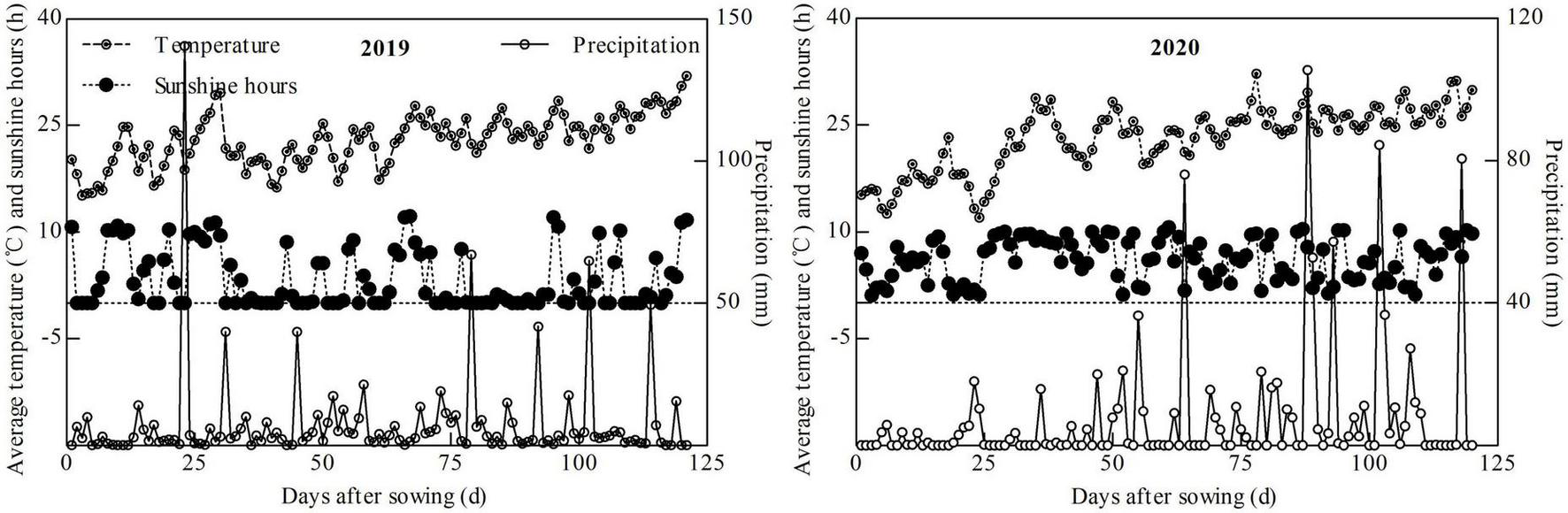 At the jointing stage (JS, 43 and 42 days after sowing in 2019 and 2020), silking stage (SS, 77 and 76 days after sowing in 2019 and 2020), and maturity stage (MS, 122 and 121 days after sowing in 2019 and 2020), five plants with an average height were sampled from the middle of each plot, and samples were divided into root, stems + sheath, leaf lamina, and ear. All samples were desiccated for 30 minutes at 105 °C, then at 80 °C until a constant weight was reached, then weighed, powdered, and passed through a 60-mesh sieve. The contents of total C and total N were determined using an element analyzer (Vario Max CN, elemental, Germany). The grain yield and 1,000-kernel weight were determined using all but the border rows in a 10-m2 area within each plot. The moisture content of the grain yield and kernel weight was adjusted to 14.0%. Yield components (row numbers, kernels per row, and kernels per ear) were determined from 20 sequential plants per plot.