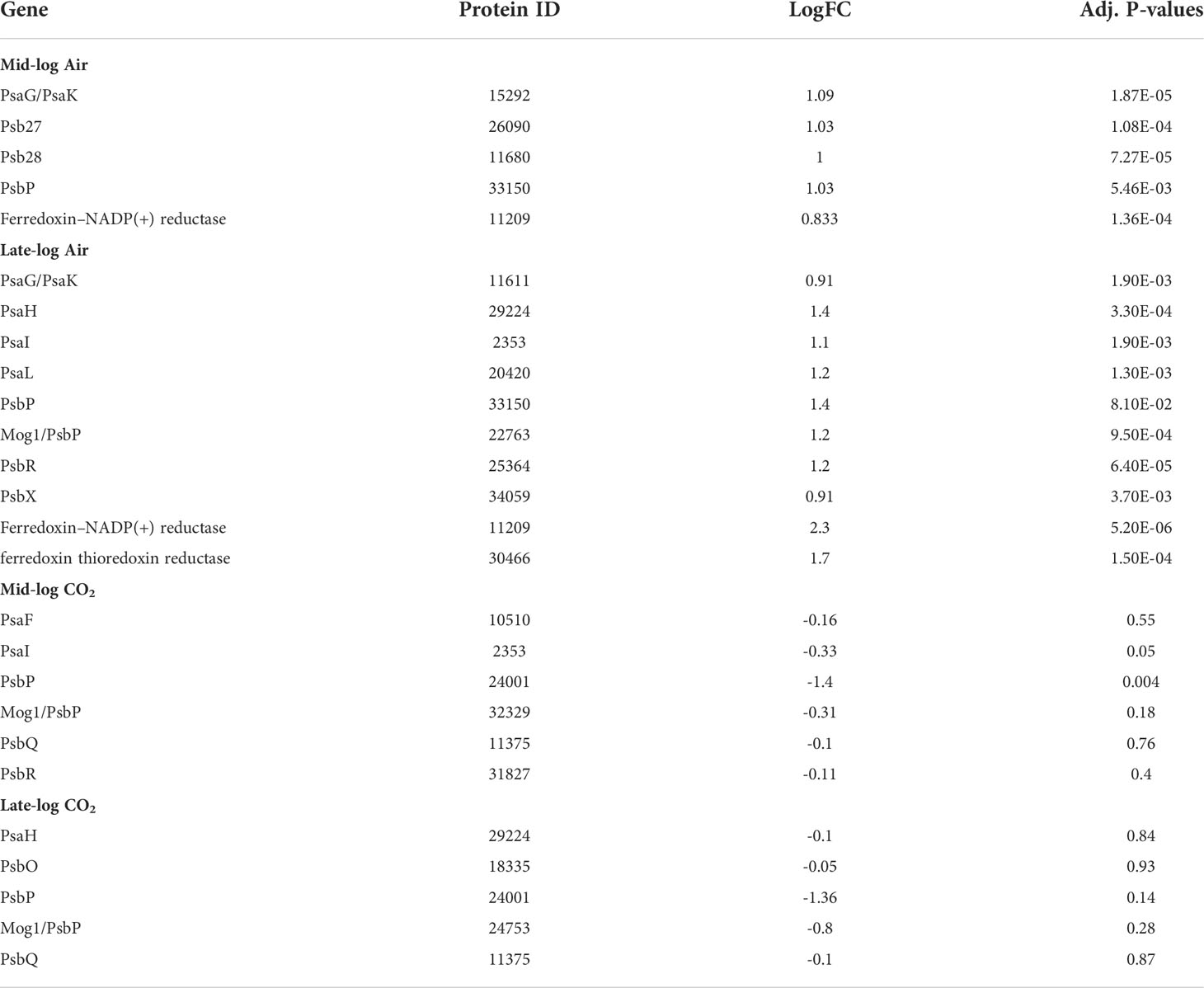 Table 1 Log fold changes, adjusted p-values, and protein ID of transcripts encoding photosystem I and II subunits of S. obliquus grown in the presence of switchgrass in ambient and 1% CO2 during mid- and late-log phase growth.